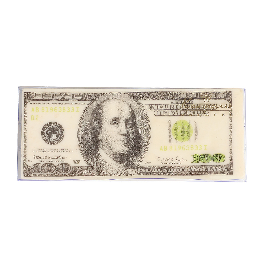 Лакомство и забавный подарок – скульптура из белого шоколада премиум-класса, на поверхность которой нанесено изображение стодолларовой купюры.
