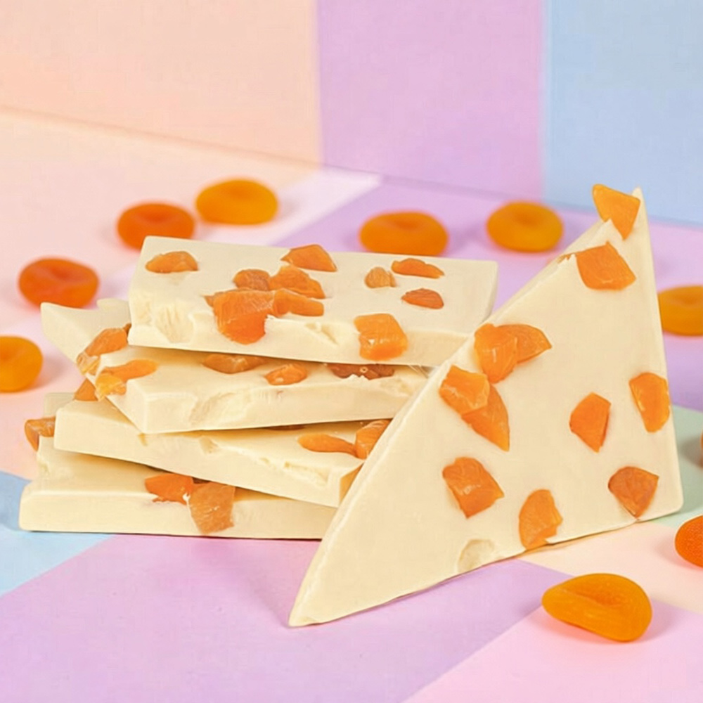 Подаренная любимой девушке упаковка с белым шоколадом, украшенным сочной курагой, - ваше безмолвное и трогательное признание в нежных чувствах...