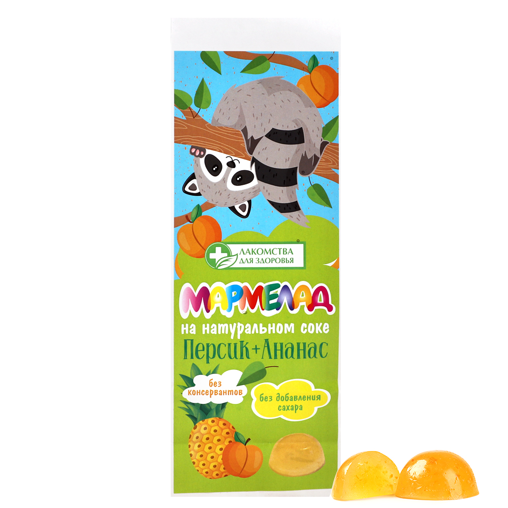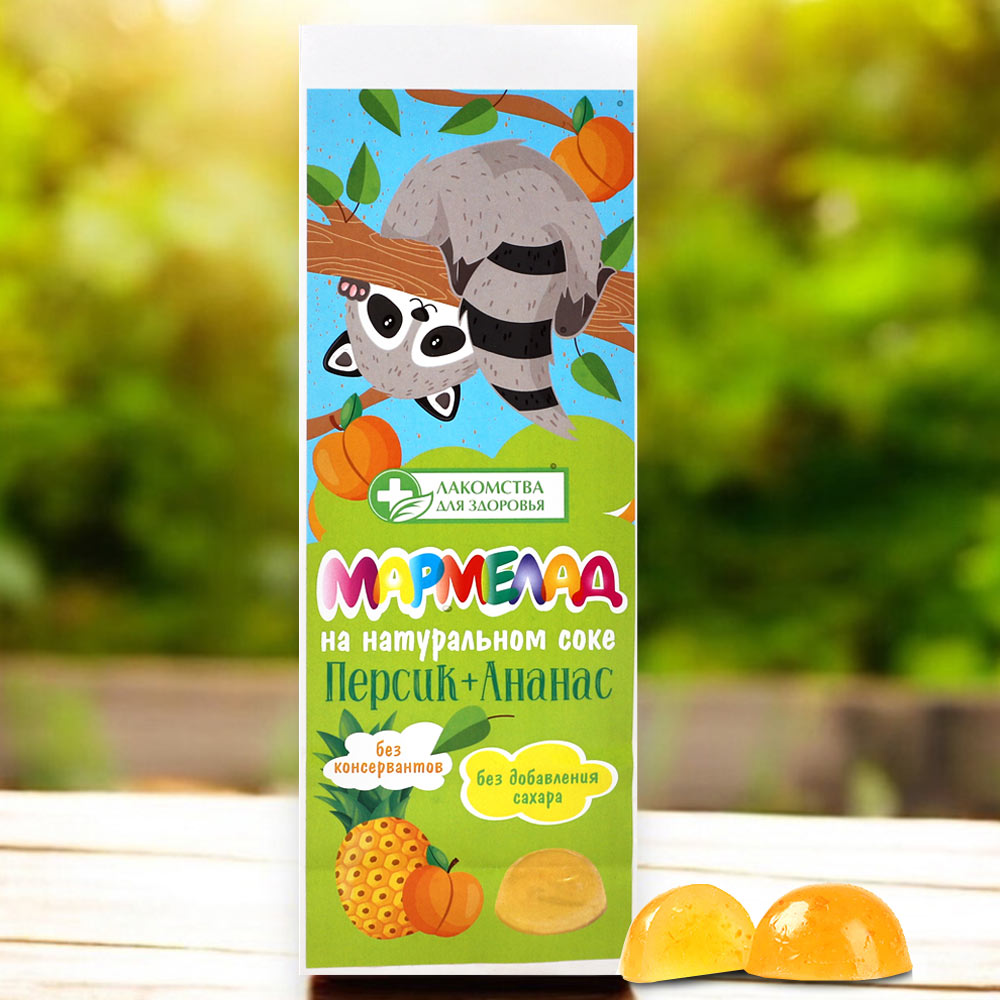 Состав: фруктоза, патока, сок персика концентрированный, сок ананаса концентрированный, желирующий агент (агар), регулятор кислотности (лимонная кислота), краситель (куркумин).
