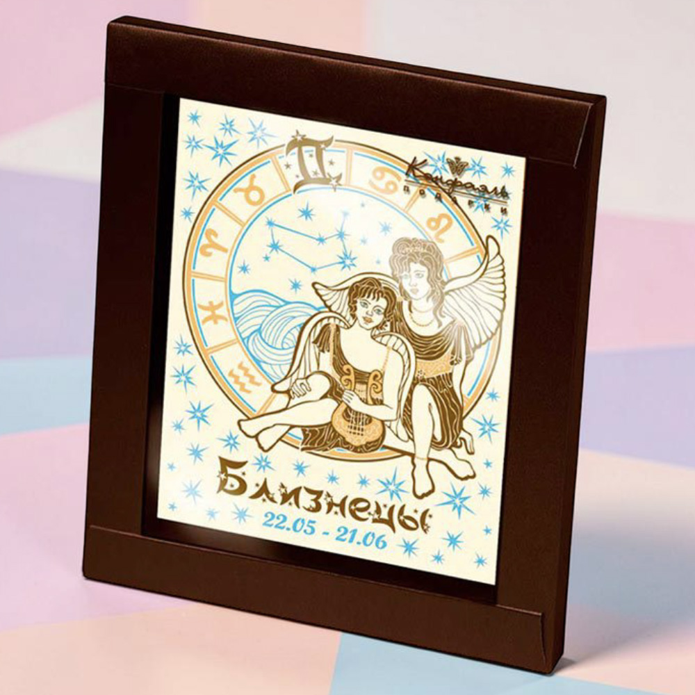 Ваш подарок близким - открытка «Знаки Зодиака - Близнецы» из шоколада в упаковке со строгим дизайном - передаст ваши чувства и оставит неизгладимое впечатление.