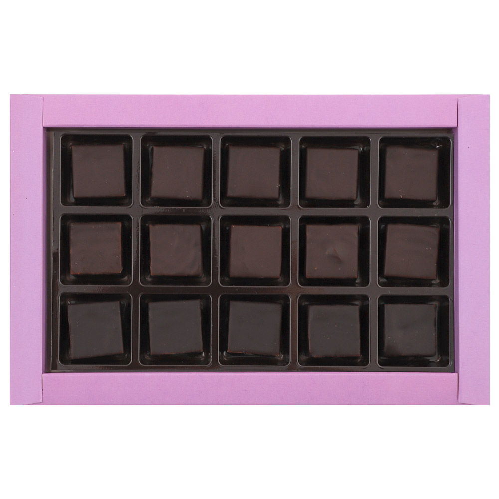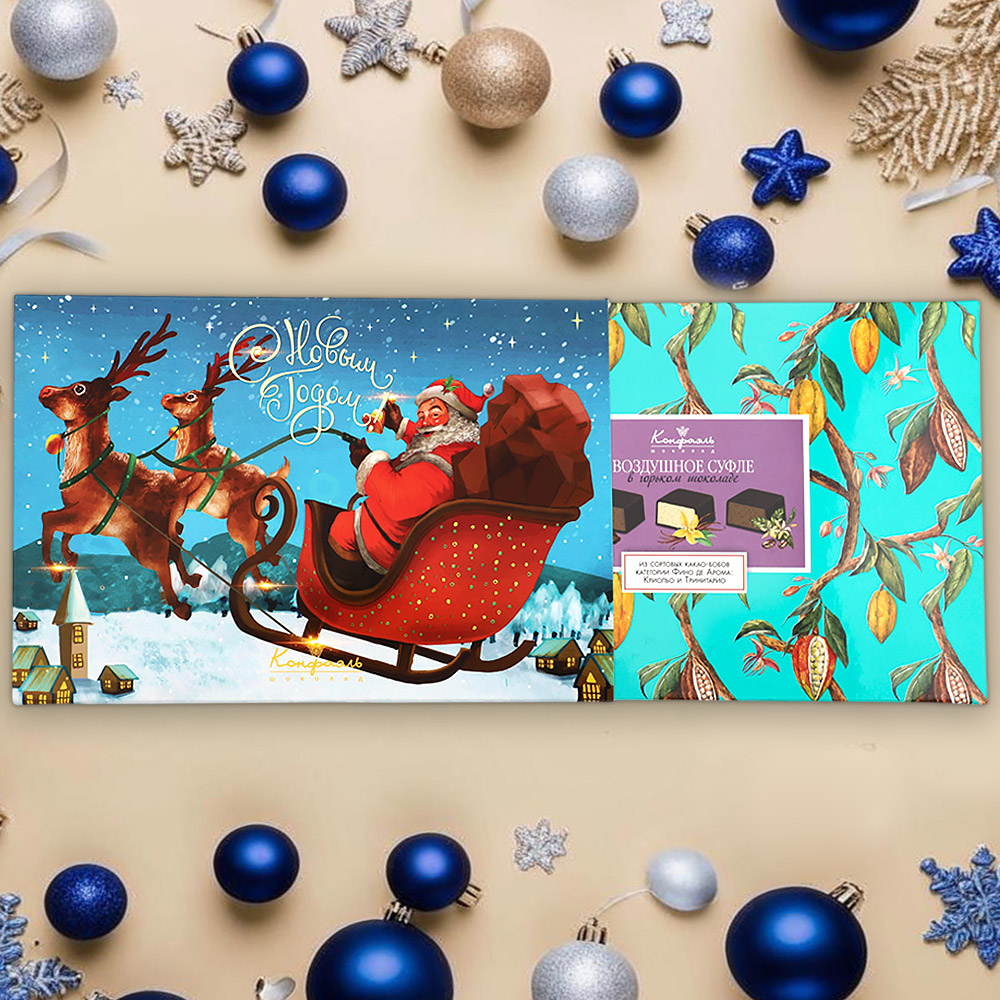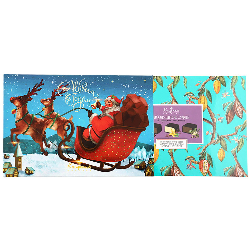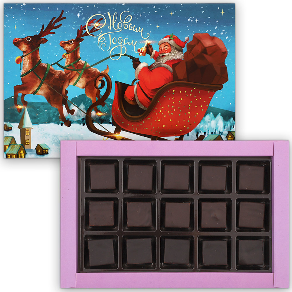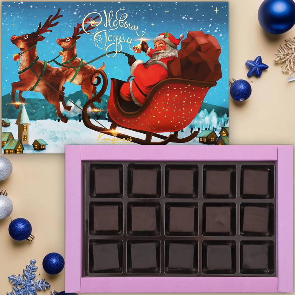 Состав: шоколадная масса - сахар, тертое какао, масло какао, какао-порошок, эмульгатор (лецитин соевый), натуральная ваниль; начинки - сахар, патока, молоко сгущенное (молоко цельное, сахар (сахароза, лактоза)), масло сладко - сливочное, белок яичный, желирующий агент (агар), консервант (сорбиновая кислота), эмульгатор (Е471), регулятор кислотности (лимонная кислота), какао-порошок, экстракт кофе, экстракт ванили, ароматизаторы, пищевой краситель ""Сахарный колер"".