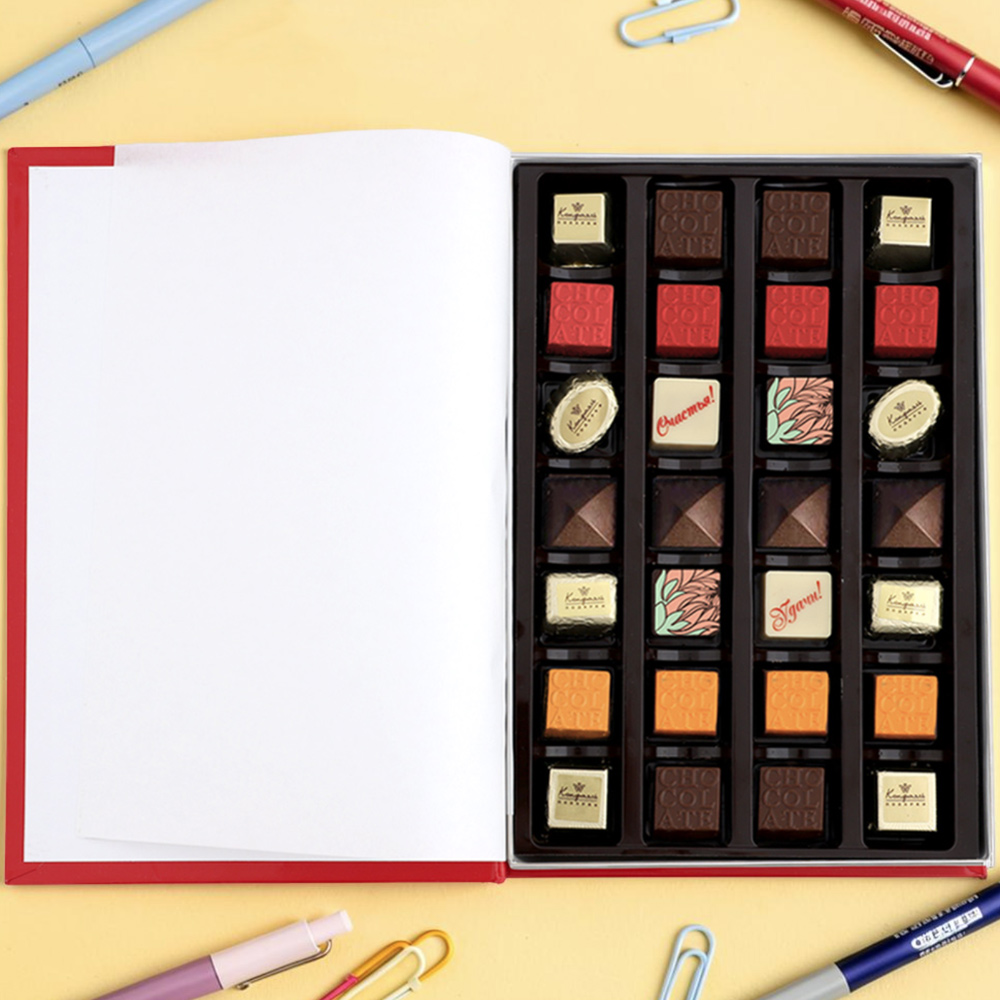 шоколадные массы - какао-масло, какао тертое, сахар, молоко сухое цельное, молоко сухое обезжиренное, лактоза, эмульгатор (лецитин соевый), ароматизатор («Ванилин»); начинки - сахар, патока, какао-масло, какао тертое, молоко сгущенное (молоко цельное, сахар (сахароза, лактоза)), сливки сгущённые с сахаром (сливки нормализованные, сахар (сахароза), лактоза), сливки сгущённые с сахаром (сливки нормализованные, сахар (сахароза), лактоза), молоко сухое, рафинированные дезодорированные растительные масла, натуральные вишневые и апельсиновые концентрированные соки, желирующие агенты (агар, желатин говяжий), стабилизатор (мальтодекстрин, гуммиарабик), коньяк (дистиллят коньячный, вода, сахар, натуральный пищевой краситель «карамельный колер»), спирт этиловый ректификованный, консервант (сорбиновая кислота), регулятор кислотности (лимонная кислота), эмульгаторы (лецитин соевый, Е471), ароматизаторы («Вишня», «Апельсин», «Ваниль», «Черная смородина»,«Клубника», «Карамель», «Кофе», «Кокосовые сливки», «Бейлиз»), натуральный пищевой краситель «Карамельный колер»