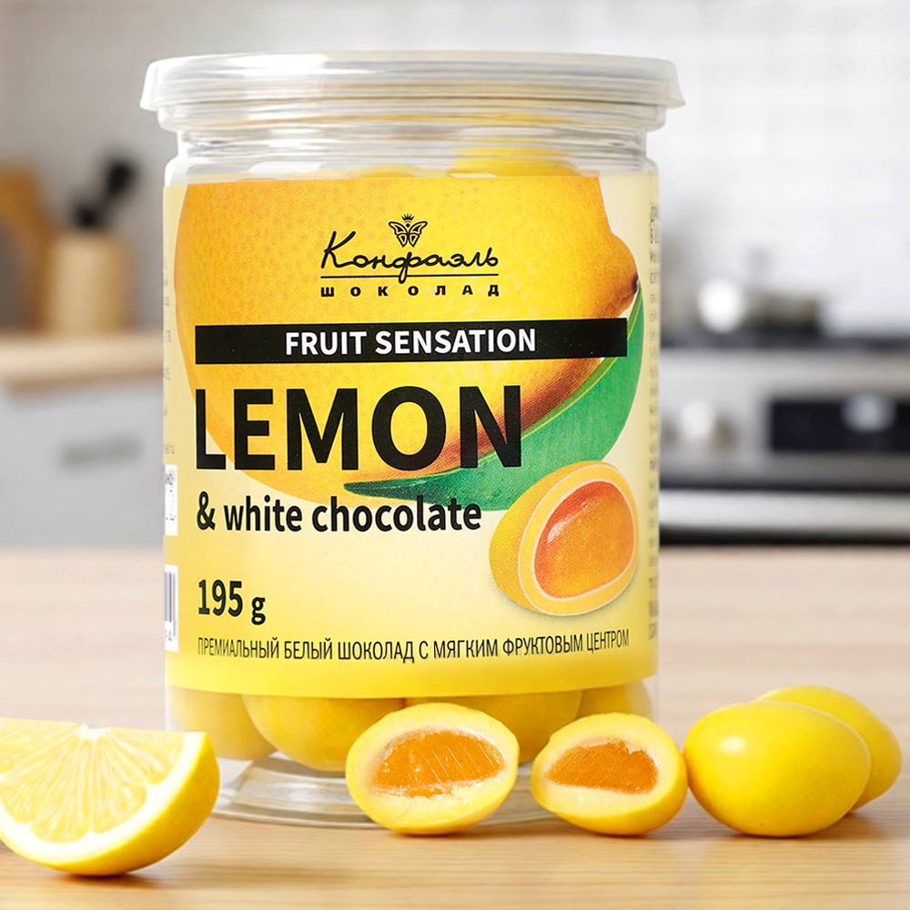 шоколадная масса - какао-масло, сахар, молоко сухое цельное, молоко сухое обезжиренное, лактоза, эмульгатор (лецитин соевый), ароматизатор ("Ванилин"); начинки - сахар, патока, натуральный концентрированный лимонный сок, желирующие агенты (агар, желатин говяжий), регулятор кислотности (лимонная кислота), ароматизаторы, пищевой краситель "Куркумин", глазирователь (капол).Энергетическая ценность на 100 г продукта: белков – 6,5 г; жиров – 23,0 г; углеводов – 65,0 г 540 ккал/2260 кДж