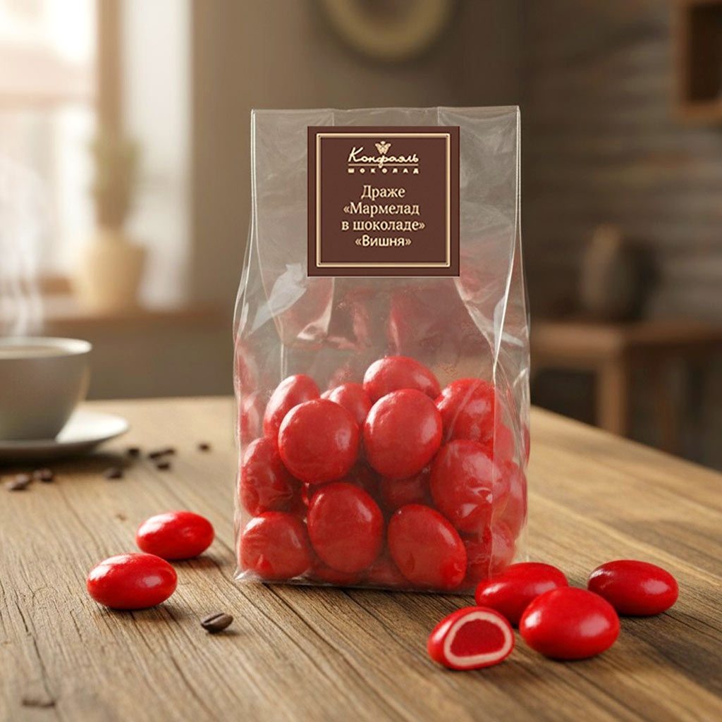 Подарите своим родным пару-тройку небольших прозрачных упаковок с драже мармелад «Вишня» в шоколаде - и вкусный десерт поднимет им настроение на весь день!