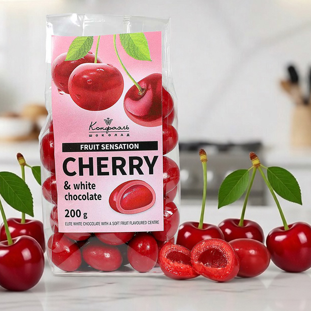 какао масло, молоко сухое цельное, молоко сухое обезжиренное, лактоза, эмульгатор (лецитин соевый), ароматизатор («Ванилин»); декор – пищевой краситель (концентрированный сок красной редиски, масло подсолнечное, эмульгаторы (мальтодекстрин, Е472с), регуляторы кислотности (лимонная кислота, аскорбиновая кислота)), глазирователь (капол); начинка – сахар, патока, желирующий агент (агар, желатин), регулятор кислотности (лимонная кислота), ароматизатор («Вишня»)