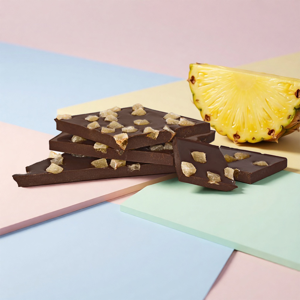 Горький шоколад с цукатами ананаса - образец настоящего качества. Волнующее сочетание магического аромата с волшебным вкусом этого десерта производит необыкновенное впечатление свежести и новизны.