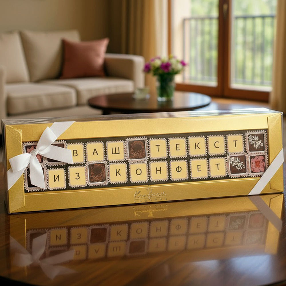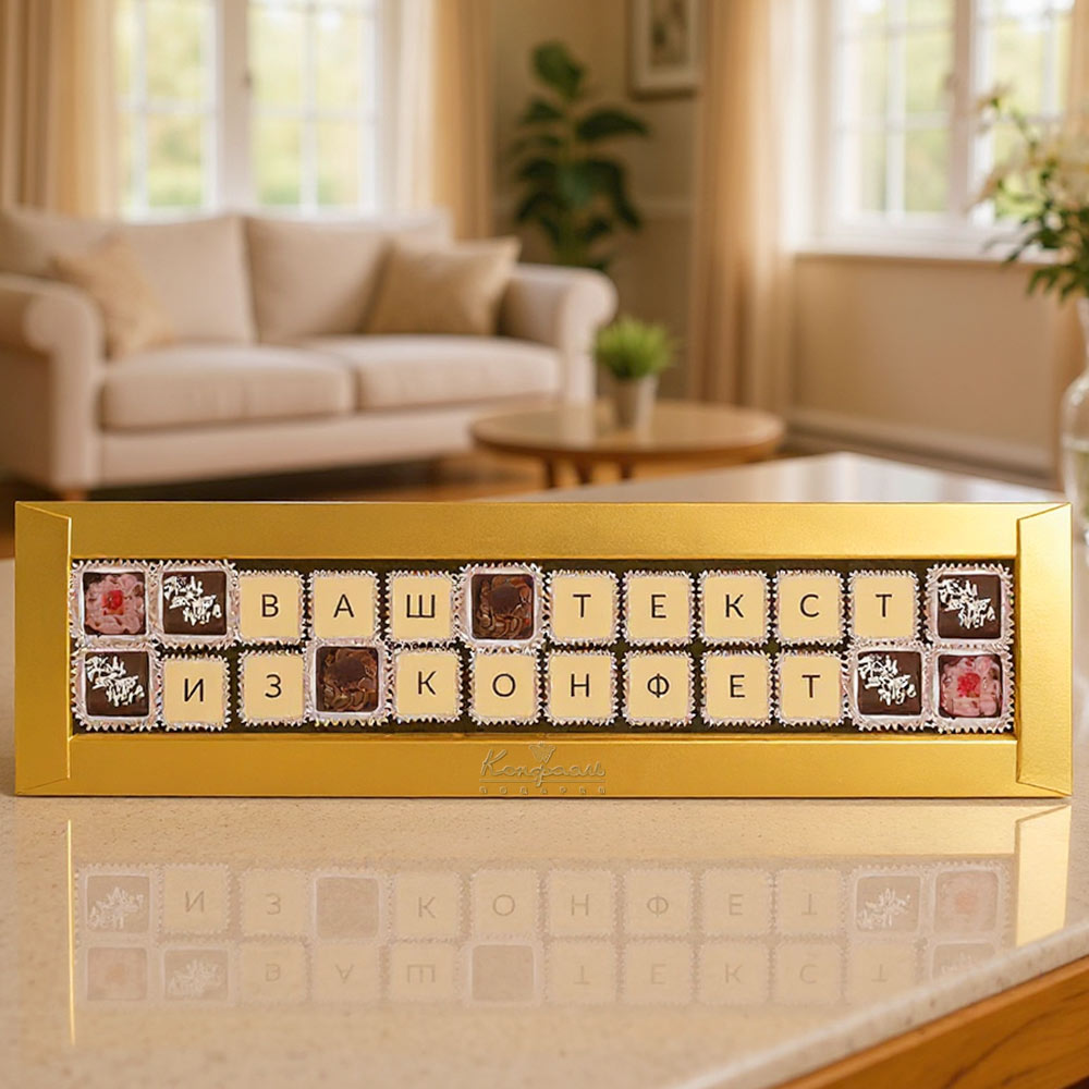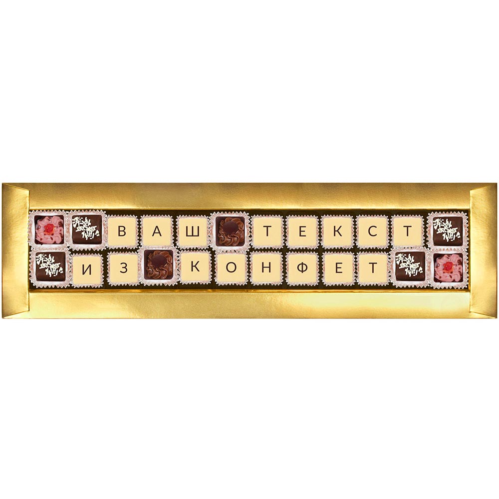 Текст выкладывается съедобной шоколадной мозаикой, которую с удовольствием съест получатель.