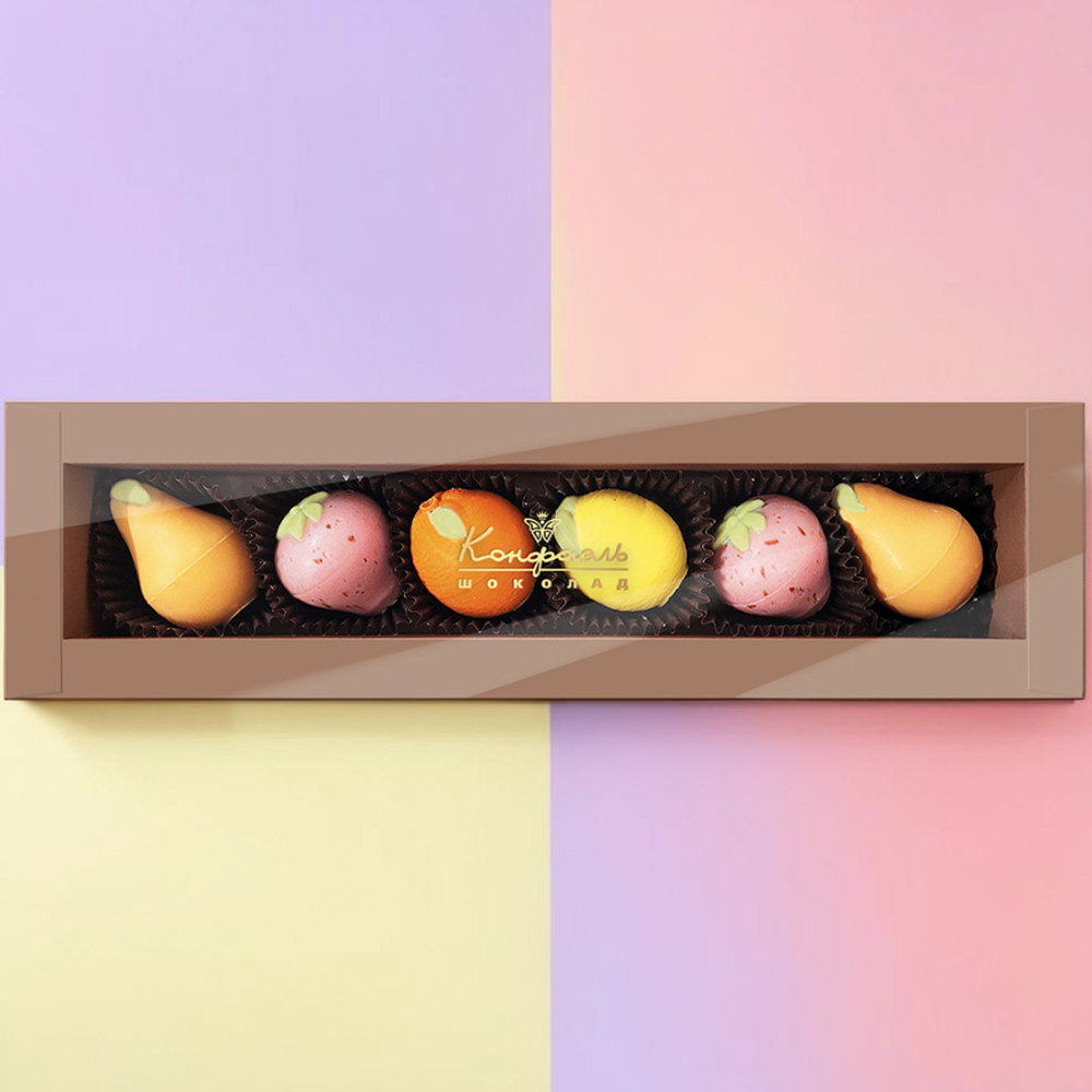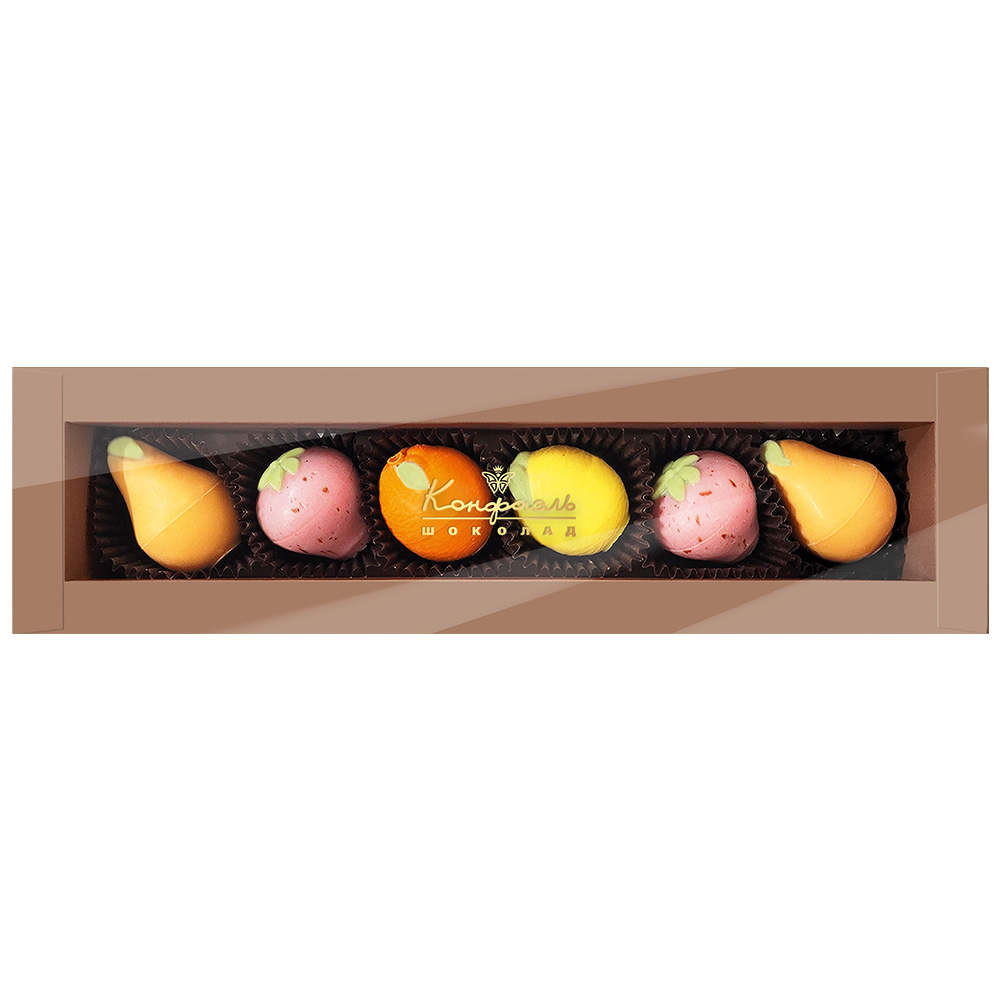 Конфеты из белого шоколада с фруктовыми начинками: итальянский лимон, сочная клубника, яркий апельсин, сладкая груша