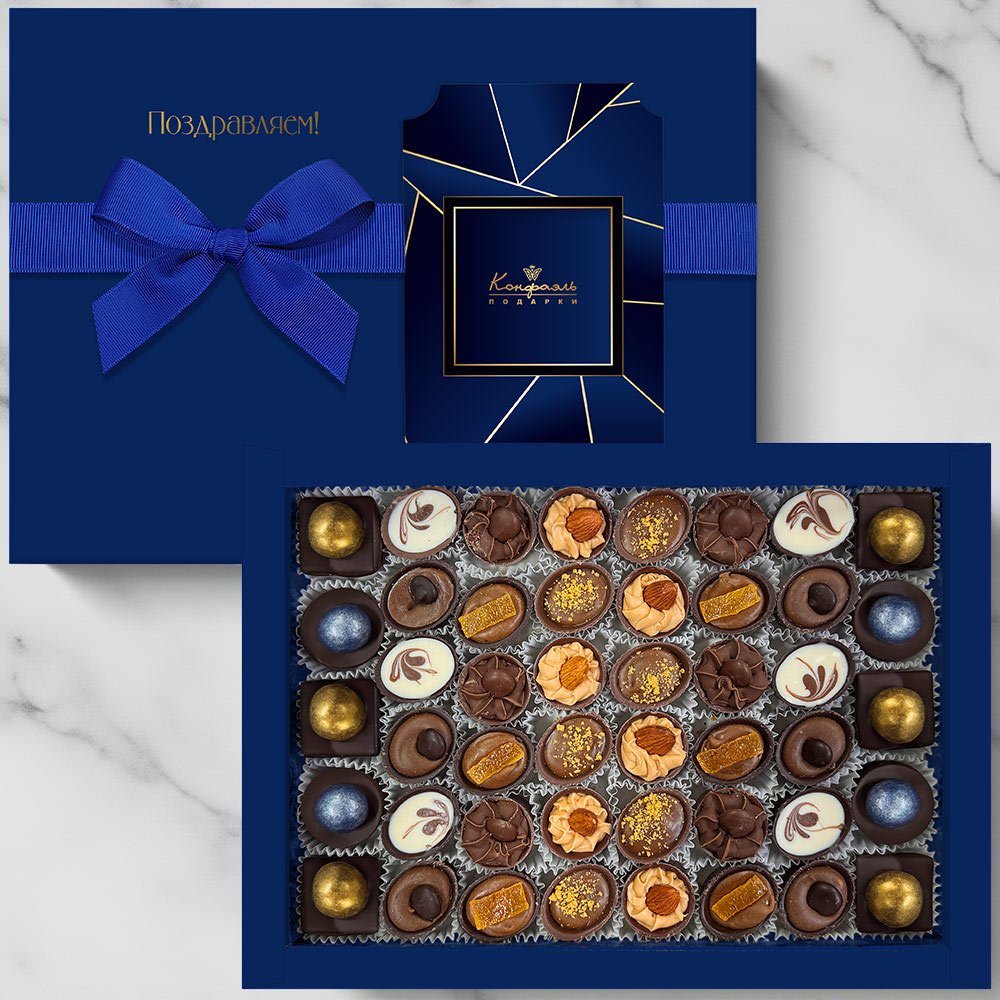 Состав: шоколад -сахар, какао тёртое, масло какао, сыворотка молочная сухая, сухое цельное молоко, эмульгатор (лецитин соевый), ароматизаторы; начинки - сахар, патока, какао-масло, какао тертое, молоко сгущенное (молоко цельное, сахар (сахароза, лактоза)), жир специального назначения (масло ши, рапсовое масло, соевое масло, антиокислитель( лимонная кислота)), молоко сухое цельное, молоко сухое обезжиренное, белый шоколад (сахар, молоко сухое цельное, масло какао, эмульгатор (лецитин соевый), ароматизатор, соль), кранч "Апельсин", паста из кофе (кофе, растительный жир), рис воздушный с какао (крупа рисовая, сахар, какао, соль), цукаты апельсиновых корочек, ананас сушеный, ядра орехов миндаля, марципановая масса, кофе натуральный молотый, стабилизаторы (мальтодекстрин), коньяк (дистиллят коньячный, вода, сахар, пищевой краситель (сахарный колер)), спирт этиловый ректификованный, консервант (сорбиновая кислота), регулятор кислотности (лимонная кислота), эмульгаторы (лецитин соевый, Е471), ароматизаторы; декор - пищевые красители (кандурин золотой, кандурин серебренный, Е132), глазирователь (капол).