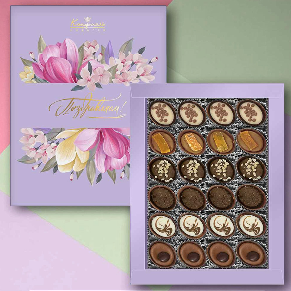 Состав: шоколадные массы – сахар, тертое какао, какао-порошок, масло какао, пахта сухая, сухое обезжиренное молоко, сухое цельное молоко, эмульгатор (лецитин соевый), соль, натуральная ваниль; начинки – сахар, патока, молоко сгущенное (молоко цельное, сахар (сахароза, лактоза)), сливки сгущенные с сахаром (сливки нормализованные, сахар (сахароза), лактоза), молоко сухое цельное, масла растительные рафинированные дезодорированные (подсолнечное, рапсовое, оливковое; масло сладко-сливочное, молоко сухое обезжиренное), сахарная пудра, жир специального назначения (масло ши, рапсовое масло, соевое масло), коньяк (дистиллят коньячный, вода, сахар, пищевой краситель «Сахарный колер»), консервант (сорбиновая кислота), регулятор кислотности (лимонная кислота), эмульгаторы (лецитин соевый, Е471), ароматизаторы, пищевые красители «Сахарный колер». Продукция производится на предприятии, где используются арахис, кунжут, орехи, яичные и молочные продукты, злаки, содержащие глютен.