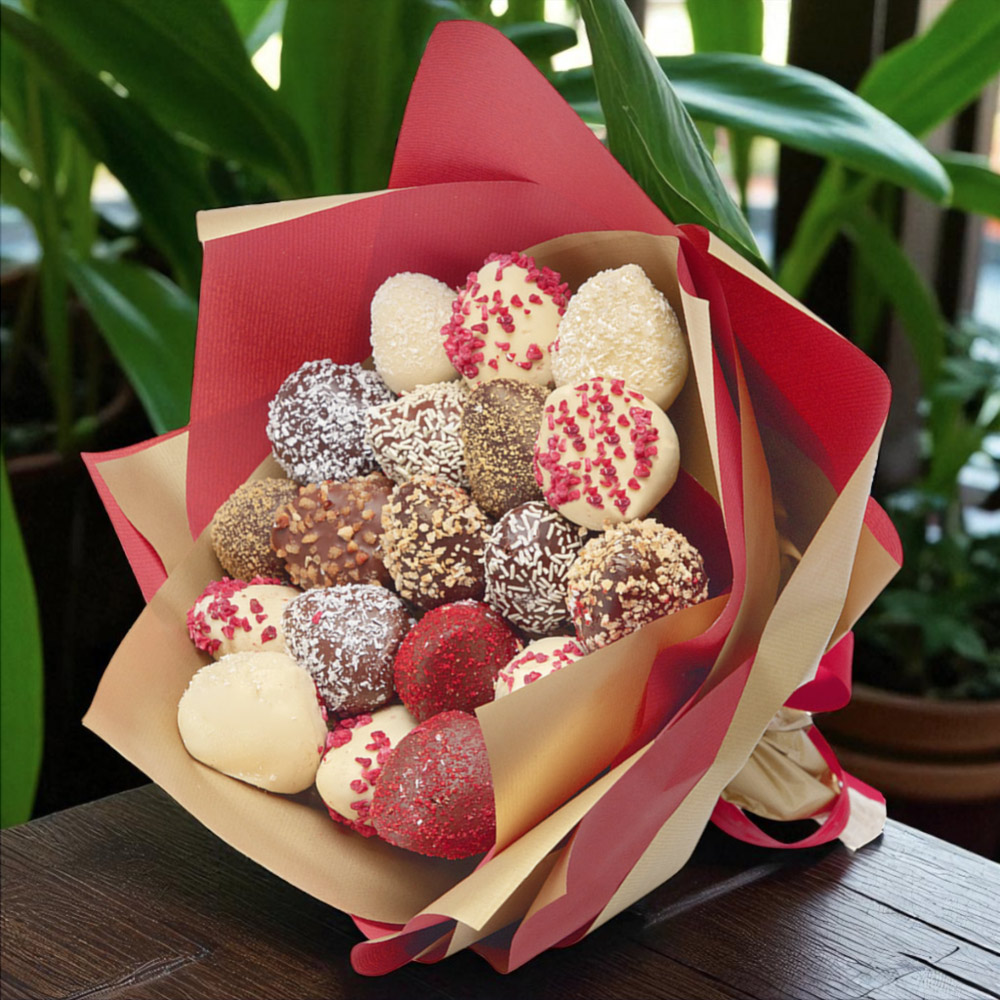 Конфеты глазированные клубника в молочном, белом шоколаде с декором: кокосовая стружка, посыпка декоративная
