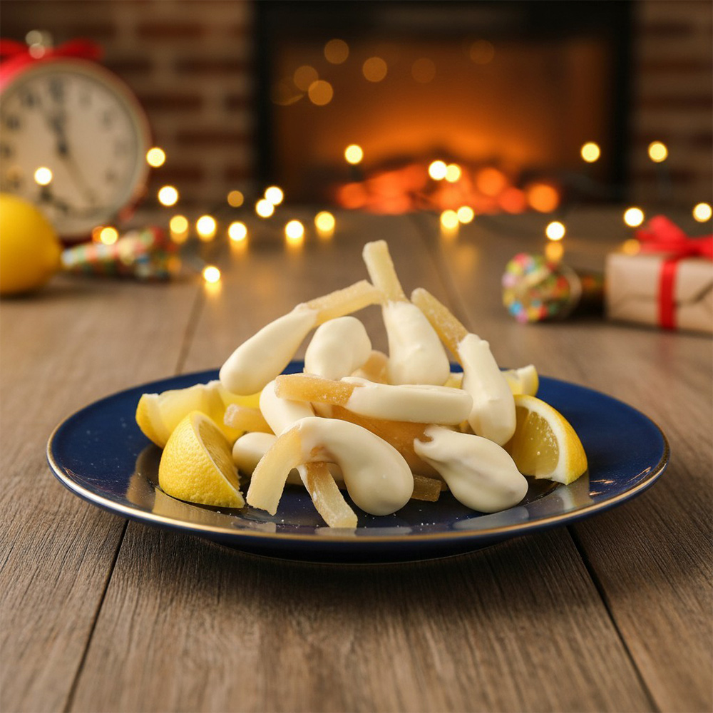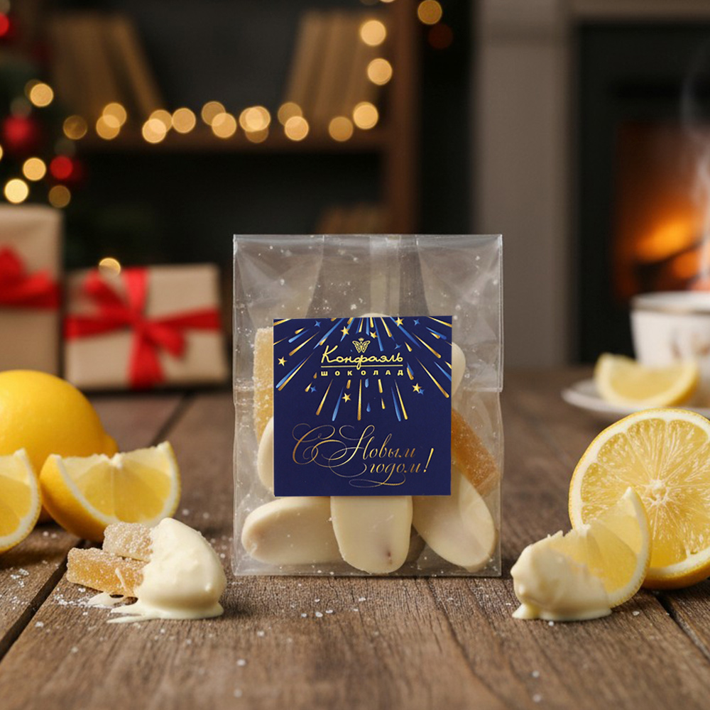 «Любимый вкус» цукаты лимонные корочки в белом шоколаде 50г (синее новогоднее оформление)