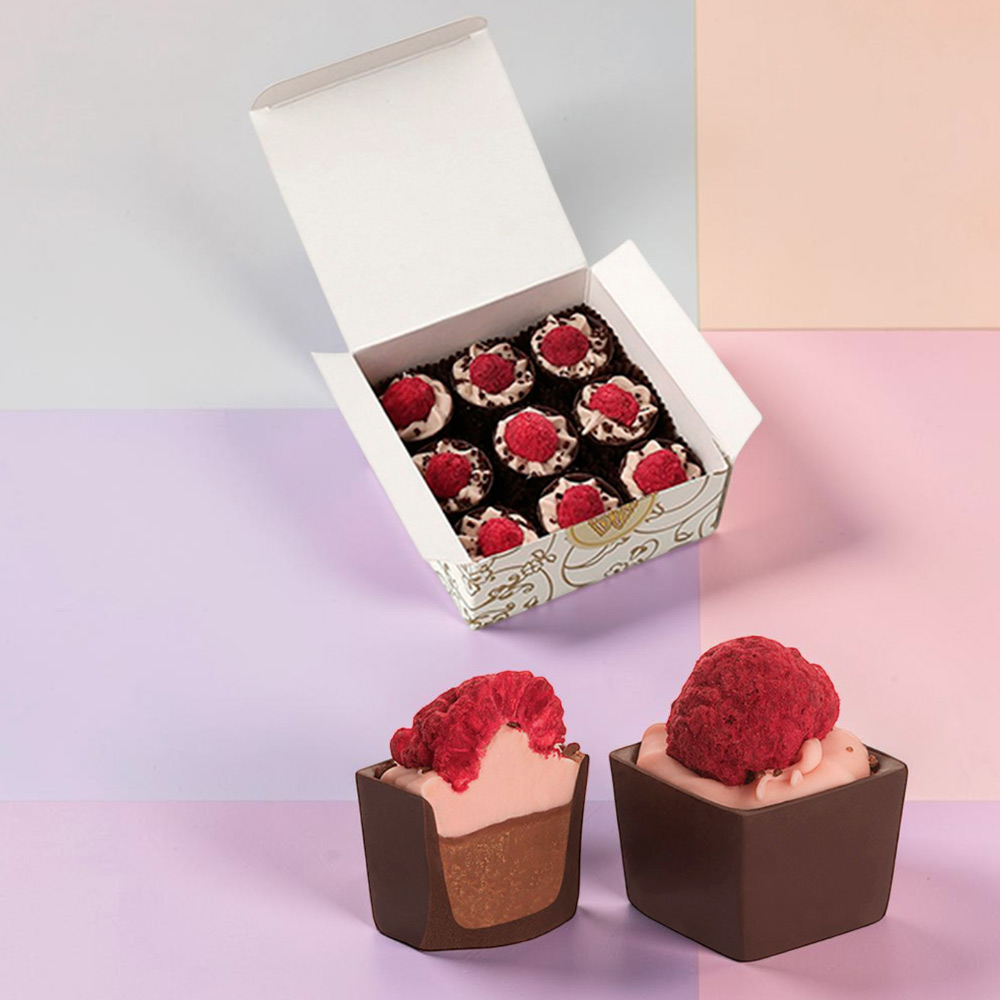 Маэстро-Мюрон - шоколадный стаканчик с двухслойной начинкой из ореховой массы «Джандуйя» и чернично-шоколадного крема, украшенная сублимированной малиной