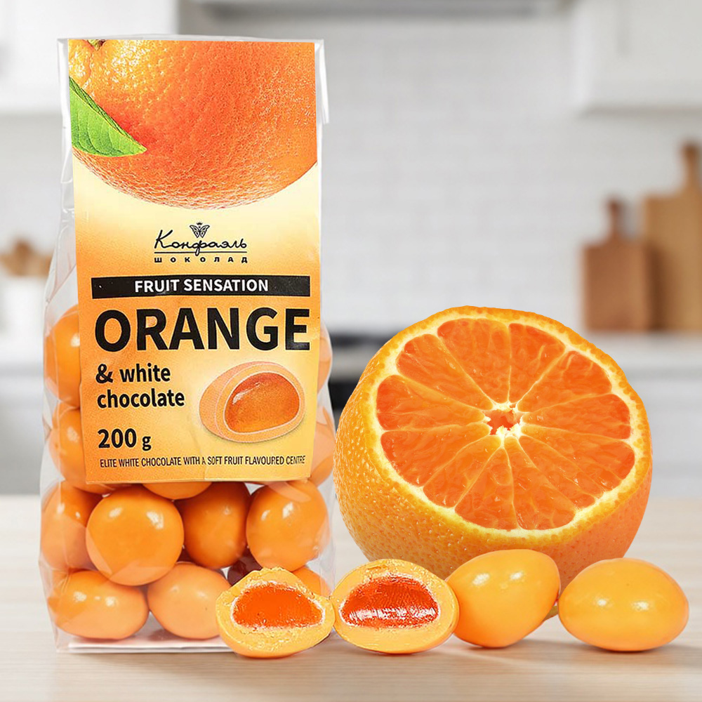 шоколадная масса – какао-масло, сахар, молоко сухое цельное, молоко сухое обезжиренное, лактоза, эмульгатор (лецитин соевый), ароматизаторы («Ванилин», «Апельсин»); начинки – сахар, патока, натуральный концентрированный Апельсиновый сок, желирующие агенты (агар, желатин говяжий), регулятор кислотности (Апельсиновая кислота), ароматизаторы, натуральный пищевой краситель «Турмерик», глазирователь (капол).