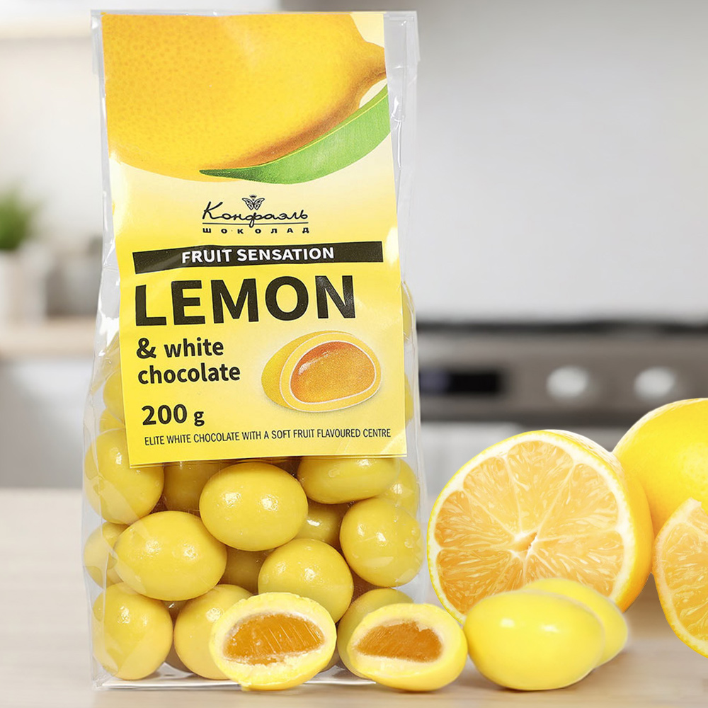какао масло, молоко сухое цельное, молоко сухое обезжиренное, лактоза, эмульгатор (лецитин соевый), ароматизатор («Ванилин»); декор – пищевой краситель (концентрированный сок красной редиски, масло подсолнечное, эмульгаторы (мальтодекстрин, Е472с), регуляторы кислотности (лимонная кислота, аскорбиновая кислота)), глазирователь (капол); начинка – сахар, патока, желирующий агент (агар, желатин), регулятор кислотности (лимонная кислота), ароматизатор («Лимон»)
