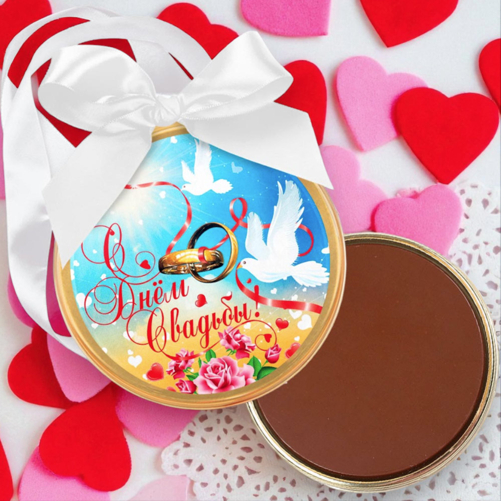 Поздравьте молодожёнов или супругов с годовщиной вкусным и трогательным подарком – медалью из нежного молочного шоколада! Это не просто сладость, а элегантный жест внимания, который подчеркнёт теплоту ваших поздравлений.