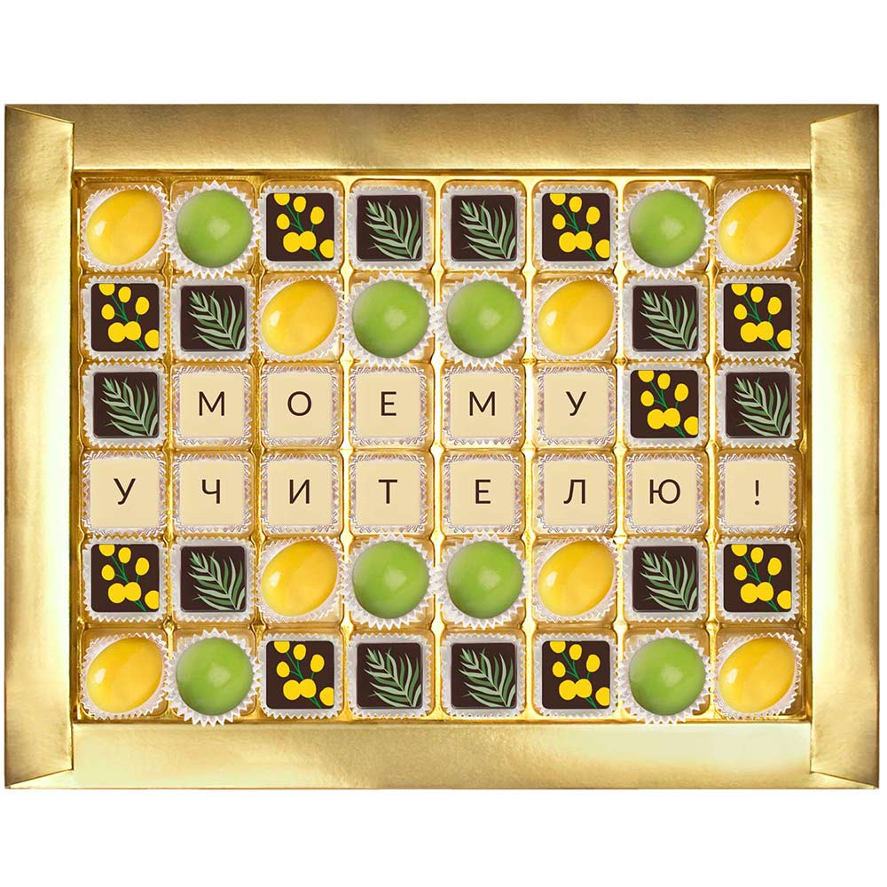 шоколадные массы – какао-масло, какао тертое, сахар, молоко сухое цельное, молоко сухое обезжиренное, лактоза, эмульгатор (лецитин соевый), ароматизатор («Ванилин»); начинки – сахар, патока, глюкозный сироп, какао-масло, какао тертое, молоко сгущенное (молоко цельное, сахар (сахароза, лактоза)), молоко сухое цельное, молоко сухое обезжиренное, лактоза, натуральные концентрированные соки (малиновый, лимонный, черносмородиновый), пюре малины, пюре манго, пюре маракуйи, малина сублимированная, мята сушеная, ядра орехов миндаля, ядра орехов фисташки, марципановая масса, какао порошок, стабилизатор (мальтодекстрин, гуммиарабик), коньяк (дистиллят коньячный, вода, сахар, пищевой краситель «Карамельный колер»), спирт этиловый ректификованный, консервант (сорбиновая кислота), регулятор кислотности (лимонная кислота), эмульгаторы (лецитин соевый, Е471), ароматизаторы, пищевой краситель «Карамельный колер»; декор – пищевые красители (Е132, Е171, Е141, «Куркумин», пищевой краситель (свекольный концентрат)), кандурин зеленый, глазирователь (капол).