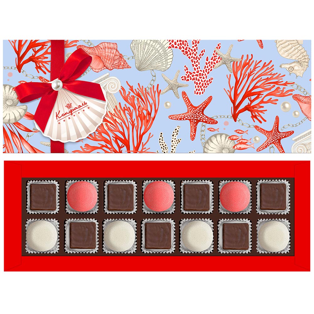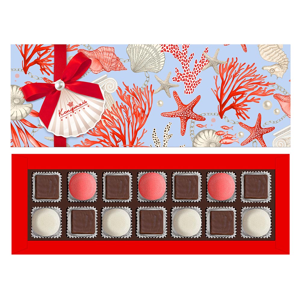 Состав: шоколад – сахар, какао тёртое, масло какао, эмульгатор (лецитин соевый), ароматизатор; начинки – сахар, патока, молоко сгущенное (молоко цельное, сахар (сахароза, лактоза)), масло сладко-сливочное, белок яичный порошкообразный, желирующий агент (агар), желатин говяжий, консервант (сорбиновая кислота), регулятор кислотности (лимонная кислота), эмульгаторы (лецитин соевый, Е471), ароматизаторы, пищевые красители ( Е171, красный свекольный, паприка). Внимание! Продукция производится на предприятии, где используются арахис, кунжут, орехи, яичные и молочные продукты, злаки, содержащие глютен.