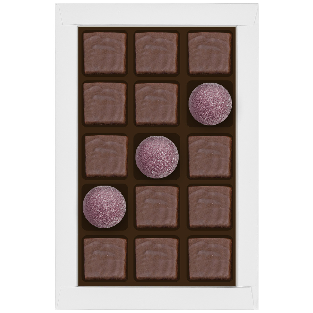 Состав: шоколадная масса -сахар, какао тертое, масло какао, какао-порошок, эмульгаторы (соевый лецитин, Е476); начинки - сахар, патока, молоко сгущенное (молоко цельное, сахар (сахароза, лактоза)), масло сладко-сливочное, белок яичный, йогурт сухой обезжиренный, желирующий агент (агар), желатин говяжий, регулятор кислотности (кислота лимонная), консервант (сорбиновая кислота), эмульгатор (Е471), экстракт ванили, ароматизаторы, пищевые красители (Е132, красный свекольный).