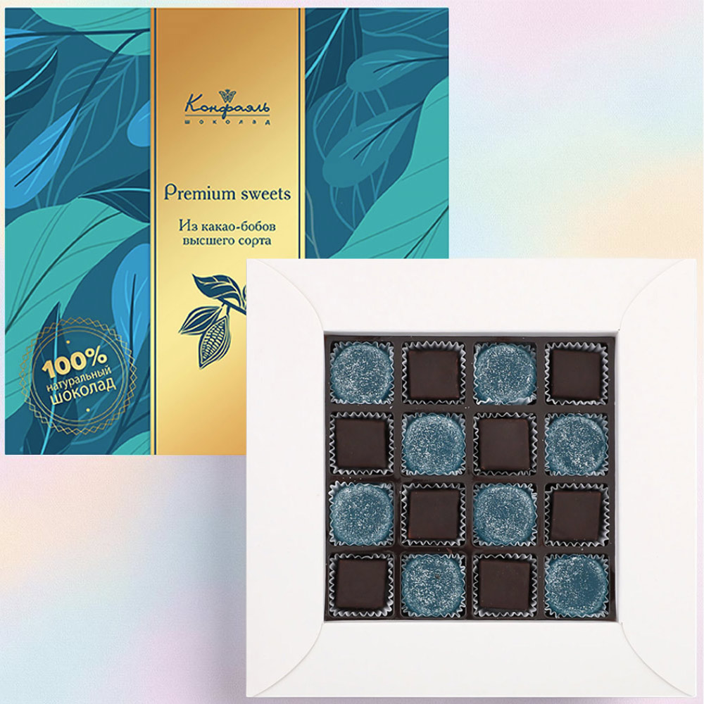 Состав: шоколадная масса – сахар, какао тертое, масло какао, какао-порошок, эмульгаторы (соевый лецитин, Е476); начинки – сахар, патока, молоко сгущенное (молоко цельное, сахар (сахароза, лактоза)), масло сладко-сливочное, белок яичный, натуральный концентрированный яблочный сок, желирующий агент (агар), желатин говяжий, регулятор кислотности (кислота лимонная), консервант (сорбиновая кислота), эмульгатор (Е471), экстракт ванили, ароматизаторы, пищевой краситель