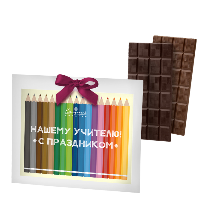 Ищете подходящий презент для учителя вашего ребёнка? Интернет-магазин «Конфаэль» предлагает отличный подарочный вариант - сладкую открытку, состоящую из двух плиток натурального шоколада - горького и молочного.