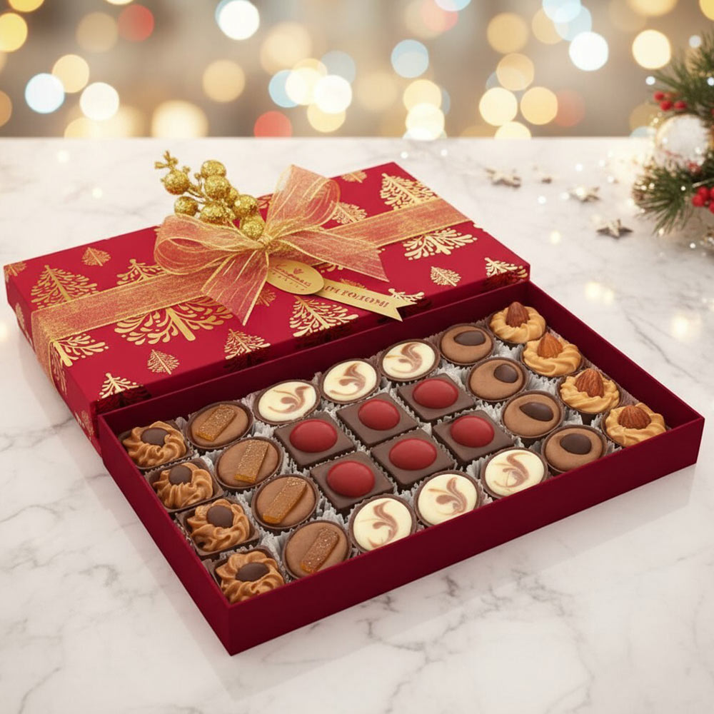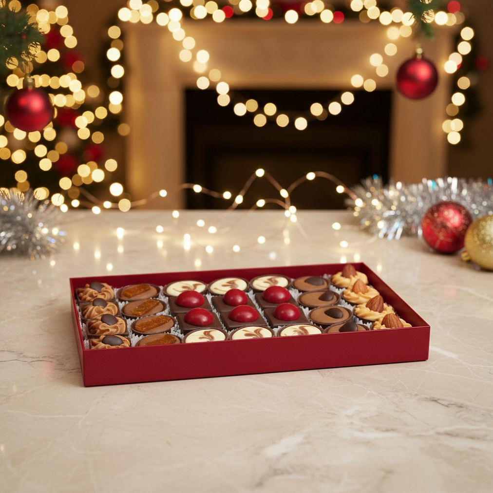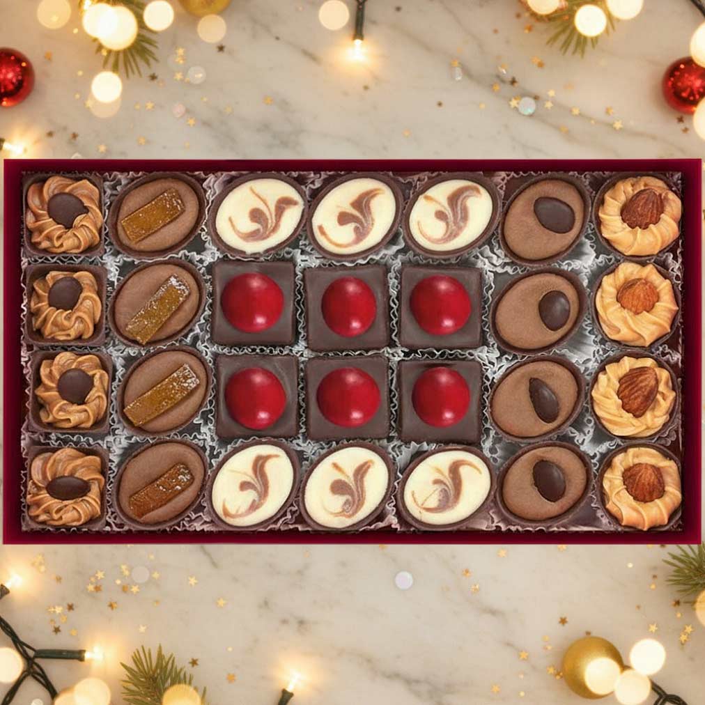 Состав: шоколадные массы – сахар, масло какао, молоко цельное сухое, сухое обезжиренное молоко, какао тертое, какао-порошок, сыворотка молочная сухая, пахта сухая, молочный жир, паста ореховая из ядер фундука, эмульгаторы (соевый лецитин, Е476), соль, натуральная ваниль, ароматизаторы; начинки – сахар, патока, фруктоза, какао-масло, какао тертое, молоко сгущенное (молоко цельное, сахар (сахароза, лактоза)), молоко сухое цельное, молоко сухое обезжиренное, масла растительные рафинированные дезодорированные (подсолнечное, рапсовое, оливковое; масло сливочное (из пастеризованных коровьих сливок), молоко сухое обезжиренное), масло сладко - сливочное, лактоза, паста из кофе (кофе, растительный жир), рис воздушный с какао (крупа рисовая, сахар, какао, соль), цукаты апельсиновых корочек, клюква сушеная, ядра орехов миндаля, марципановая масса, кофе натуральный молотый, стабилизатор (мальтодекстрин), коньяк (дистиллят коньячный, вода, сахар, пищевой краситель (сахарный колер)), спирт этиловый ректификованный, консервант (сорбиновая кислота), регулятор кислотности (лимонная кислота), эмульгаторы (лецитин соевый, Е471), ароматизаторы, пищевой краситель (сахарный колер); декор – пищевой краситель (красный свекольный), глазирователь (капол).