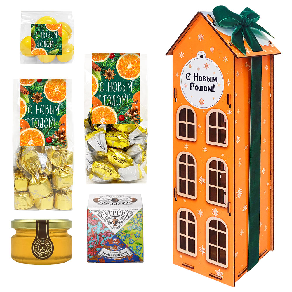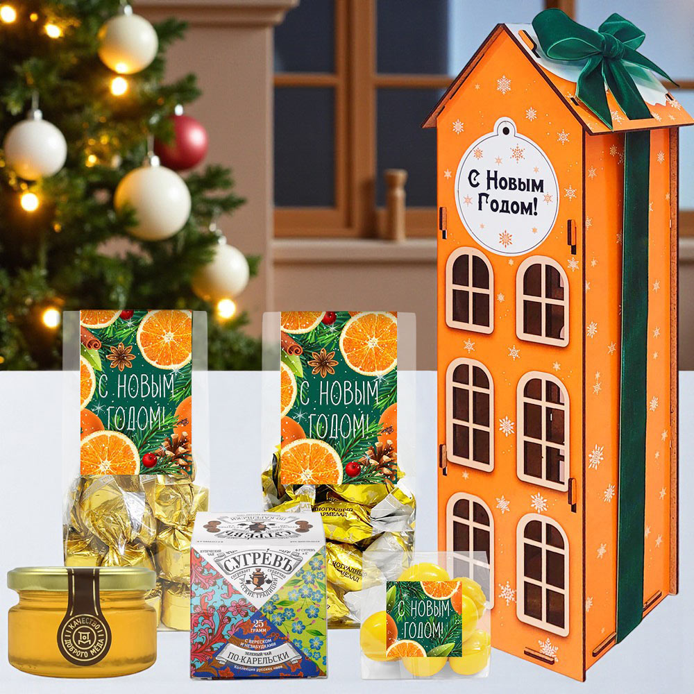 Новогодний домик с конфетами: ассорти, мармелад, драже, мед, чай 565г