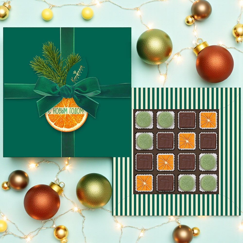 Мармелад желейный со вкусом «Зеленая дыня», конфеты «Суфле» в горьком шоколаде (апельсиновое), шоколадные конфеты «Ассорти» с кремовой начинкой и декором