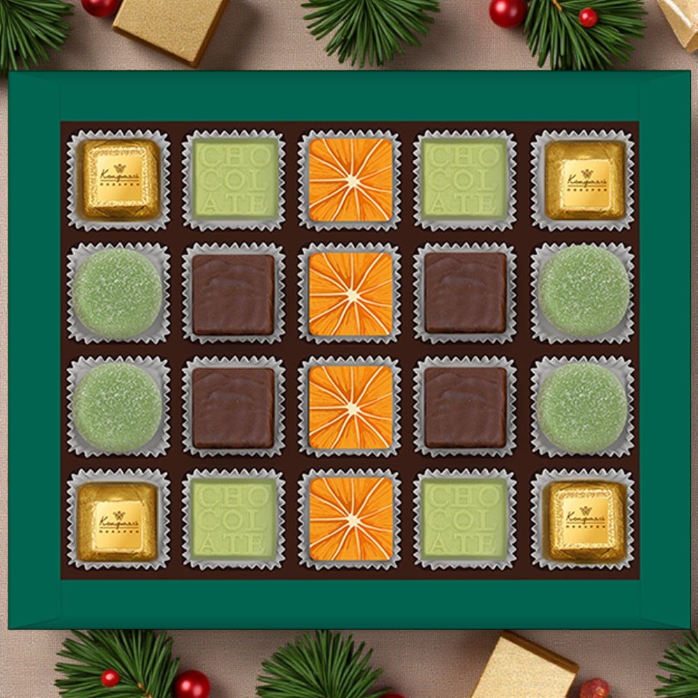 Состав: шоколадные массы - сахар, тертое какао, какао-порошок, масло какао, сухое обезжиренное молоко, сухое цельное молоко, пахта сухая, эмульгатор (лецитин соевый), соль, натуральная ваниль; начинки - сахар, патока, какао-масло, какао тертое, молоко сгущенное (молоко цельное, сахар (сахароза, лактоза)), масла растительные рафинированные дезодорированные (подсолнечное, рапсовое, оливковое; масло сладко-сливочное, молоко сухое обезжиренное), жир специального назначения (масло ши, рапсовое масло, соевое масло, антиокислитель (лимонная кислота)), молоко сухое цельное, молоко сухое обезжиренное, белый шоколад (сахар, масло какао, сухое обезжиренное молоко, сухое цельное молоко, эмульгатор (лецитин соевый), экстракт ванили), масло сладко - сливочное, белок яичный порошкообразный, стабилизатор (мальтодекстрин), желирующий агент (агар), коньяк (дистиллят коньячный, вода, сахар, пищевой краситель (сахарный колер)), консервант (сорбиновая кислота), регулятор кислотности (лимонная кислота), эмульгаторы (лецитин соевый, Е471), чай Матча, сухой сок апельсина, ароматизаторы, пищевые красители (сахарный колер, Е171, комплексы меднохлорофиллов и хлорофиллинов); декор - пищевые красители (Е171, Е172, паприка).