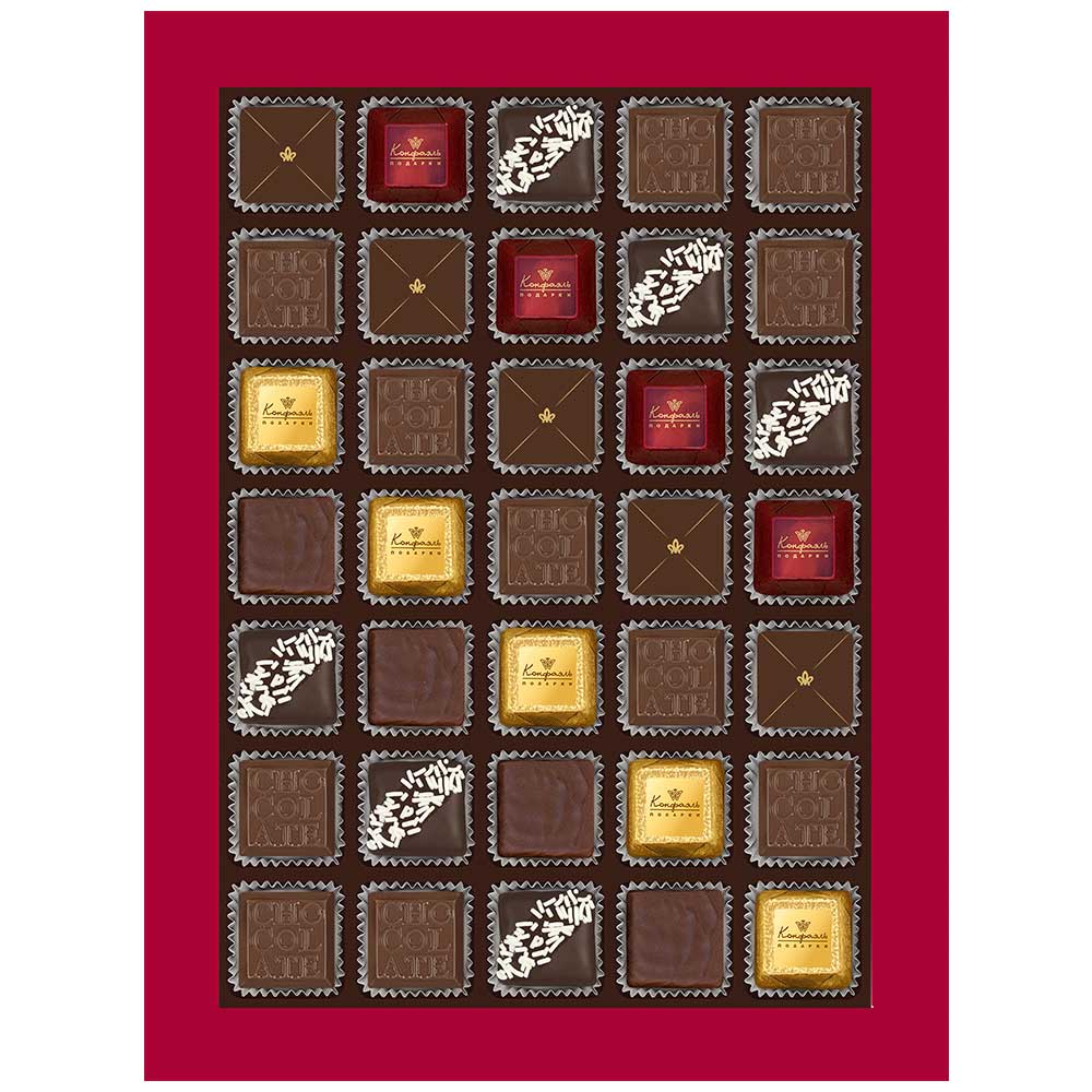 Состав: шоколадные массы – сахар, тертое какао, какао-порошок, масло какао, сыворотка молочная сухая, сухое цельное молоко, молочный жир, паста ореховая из ядер фундука, эмульгаторы (лецитин соевый, Е476), соль, ароматизаторы; начинки – сахар, патока крахмальная карамельная, масло какао, тертое какао, молоко сгущенное (молоко цельное, сахар (сахароза, лактоза)), молоко сухое цельное, молоко сухое обезжиренное, масла растительные рафинированные дезодорированные (подсолнечное, рапсовое, оливковое; масло сливочное, молоко сухое обезжиренное), масло сладко-сливочное, жир специального назначения (масло ши, рапсовое масло, соевое масло), белок яичный, кумкват, клубника сушеная, цукаты лимонных корочек, папайя сушеная, ананас сушеный, финики, чернослив, абрикос сушеный, ядра орехов фундука, ядра орехов миндаля, вафельная крошка (мука пшеничная х/п первого сорта, сахар, масло кокосовое рафинированное дезодорированное, эмульгатор (лецитин соевый), пшеничные волокна (клетчатка), ароматизатор), стабилизатор (мальтодекстрин), желирующий агент (агар), коньяк (дистиллят коньячный, вода, сахар, пищевой краситель «Сахарный колер»), спирт этиловый ректификованный, консервант (сорбиновая кислота), регулятор кислотности (лимонная кислота), эмульгаторы (лецитин соевый, Е471), ароматизаторы, пищевые красители «Сахарный колер»; декор – пищевые красители (Е171, «Куркумин»). Внимание! Продукция производится на предприятии, где используются арахис, кунжут, орехи, яичные и молочные продукты, злаки, содержащие глютен.
