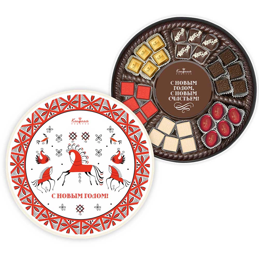 Состав: шоколадные массы -сахар, масло какао, молоко цельное сухое, сухое обезжиренное молоко, какао тертое, какао-порошок, сыворотка молочная сухая, пахта сухая, молочный жир, паста ореховая из ядер фундука, эмульгаторы (соевый лецитин, Е476), соль, натуральная ваниль, ароматизаторы; начинки - сахар, патока, фруктоза, молоко сгущенное (молоко цельное, сахар (сахароза, лактоза)), сухое обезжиренное, сливки сгущенные с сахаром (сливки нормализованные, сахар (сахароза), лактоза), молоко сухое цельное, масла растительные рафинированные дезодорированные (подсолнечное, рапсовое, оливковое; масло сладко-сливочное, молоко сухое обезжиренное),жир специального назначения (масло ши, рапсовое масло, соевое масло), масло сладко-сливочное, кумкват, клубника сушеная, апельсин сушеный,вафельная крошка( мука пшеничная х/п первого сорта, сахар, масло кокосовое рафинированное дезодорированное, пшеничные волокна (клетчатка), цукаты лимонных корочек, папайя сушеная, ананас сушеный, финики, чернослив, абрикос сушеный, ядра орехов фундука, ядра орехов миндаля, какао-порошок, стабилизатор (мальтодекстрин), желирующие агенты (агар), желатин говяжий), коньяк (дистиллят коньячный, вода, сахар, пищевой краситель «Сахарный колер""), спирт этиловый ректификованный, антиоксидант (экстракт розмарина), консервант (сорбиновая кислота), регулятор кислотности (лимонная кислота), эмульгаторы (лецитин соевый, Е471), ароматизаторы, пищевые красители «Сахарный колер» декор - пищевые красители ( Е171, свекольный концентрат), Внимание! В продукте возможно наличие фрагментов фруктовых косточек (кураги натуральной, фиников натуральных, чернослива натурального). Продукция производится на предприятии, где используются арахис, кунжут, орехи, яичные и молочные продукты, злаки, содержащие глютен.