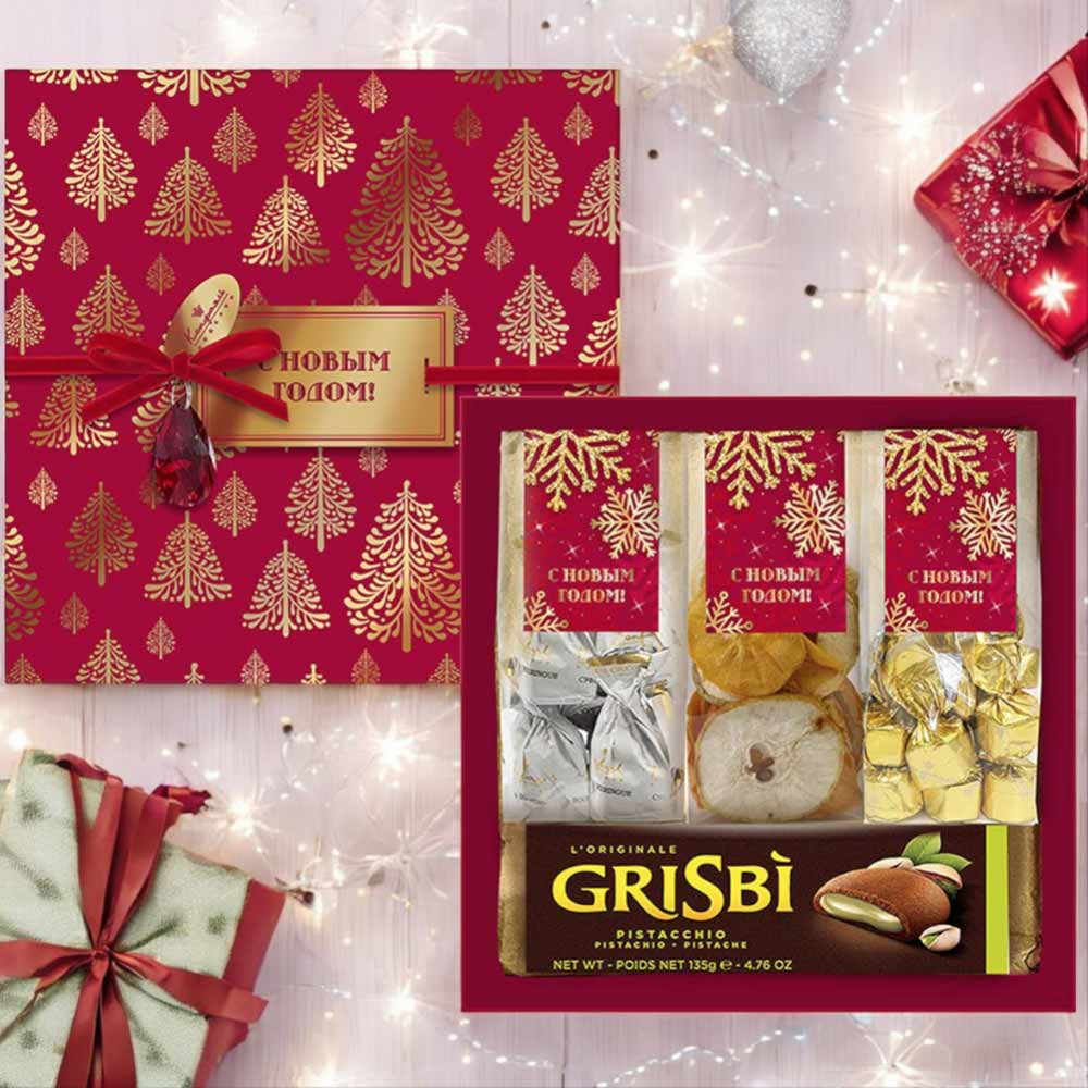 Шоколадные конфеты «Ассорти» с шоколадной начинкой / 150 г Клубничное суфле и ванильное безе в горьком шоколаде / 115 г Фруктовые чипсы в ассортименте / 100 г Печенье с фисташковой начинкой ТМ GRISBI / 135 г