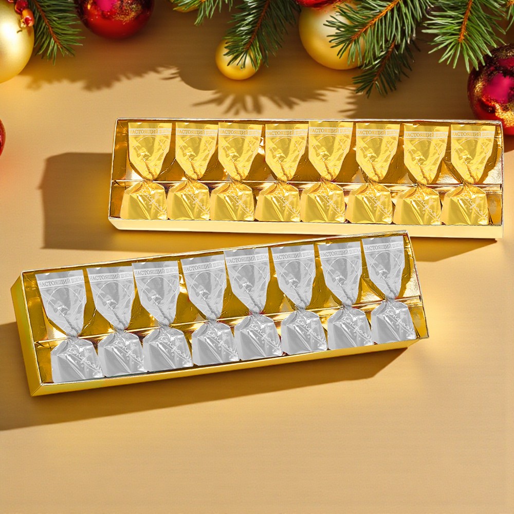 Состав: шоколадная масса – сахар, какао-масло, какао тертое, сыворотка молочная сухая, лактоза, молоко сухое цельное, молоко сухое обезжиренное, эмульгатор (лецитин соевый), ароматизатор («Ванилин»); начинки сахар, патока, какао-масло, какао тертое, молоко сгущенное (молоко цельное, сахар (сахароза, лактоза)), ядра орехов миндаля, стабилизатор (мальтодекстрин), коньяк (дистиллят коньячный, вода, сахар, пищевой краситель «Сахарный колер»), спирт этиловый ректификованный, консервант (сорбиновая кислота), регулятор кислотности (лимонная кислота), эмульгаторы (лецитин соевый, Е471), ароматизаторы. Продукция производится на предприятии, где используются арахис, кунжут, орехи, яичные и молочные продукты, злаки, содержащие глютен.