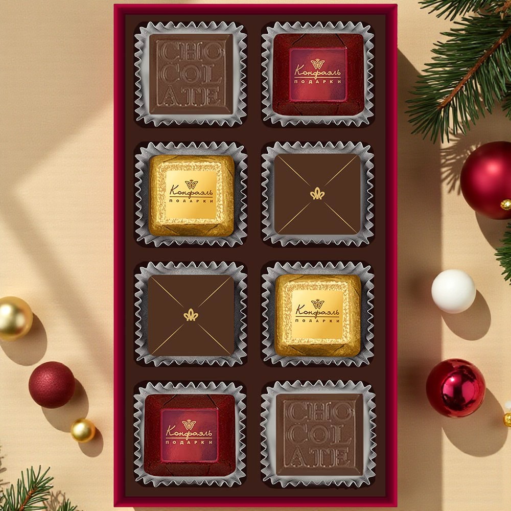 Состав: шоколадные массы - сахар, тертое какао, какао-порошок, масло какао, сыворотка молочная сухая, сухое цельное молоко, молочный жир, паста ореховая из ядер фундука, эмульгаторы (лецитин соевый, Е476), соль, ароматазиторы; начинки - сахар, патока крахмальная карамельная, молоко сгущенное (молоко цельное, сахар (сахароза, лактоза)), молоко сухое цельное, молоко сухое обезжиренное, масла растительные рафинированные дезодорированные (подсолнечное, рапсовое, оливковое; масло сливочное, молоко сухое обезжиренное), жир специального назначения (масло ши, рапсовое масло, соевое масло), вафельная крошка (мука пшеничная х/п первого сорта, сахар, масло кокосовое рафинированное дезодорированное, эмульгатор (лецитин соевый), пшеничные волокна (клетчатка), ароматизатор), стабилизатор (мальтодекстрин), консервант (сорбиновая кислота), эмульгаторы (лецитин соевый, Е471), ароматизаторы, пищевые красители «Сахарный колер»; декор - пищевые красители (Е171, «Куркумин»).