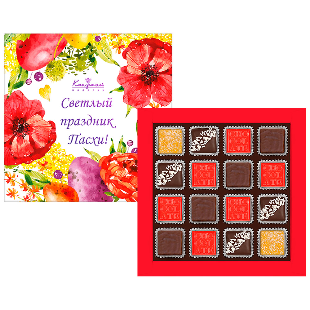 Состав: шоколадные массы -сахар, тертое какао, какао-порошок, масло какао, сухое обезжиренное молоко, сухое цельное молоко, пахта сухая, эмульгатор (лецитин соевый), соль, натуральная ваниль; начинки - сахар, патока, какао-масло, какао тертое, молоко сгущенное (молоко цельное, сахар (сахароза, лактоза)), масла растительные рафинированные дезодорированные (подсолнечное, рапсовое, оливковое; масло сладко-сливочное, молоко сухое обезжиренное), масло сладко - сливочное, белок яичный порошкообразный, натуральный концентрированный апельсиновый сок, цукаты апельсиновых корочек, папайя сушеная, ананас сушеный, финики, чернослив, абрикос сушеный, ядра орехов фундука, ядра орехов миндаля, стабилизатор (мальтодекстрин), желирующий агент (агар), желатин говяжий, коньяк (дистиллят коньячный, вода, сахар, пищевой краситель (сахарный колер)), спирт этиловый ректификованный, консервант (сорбиновая кислота), регулятор кислотности (лимонная кислота), эмульгаторы (лецитин соевый, Е471), ароматизаторы, пищевые красители (сахарный колер, красный свекольный). Внимание! В продукте возможно наличие фрагментов фруктовых косточек (кураги натуральной, фиников натуральных, чернослива натурального). Продукция производится на предприятии, где используются арахис, кунжут, орехи, яичные и молочные продукты, злаки, содержащие глютен.