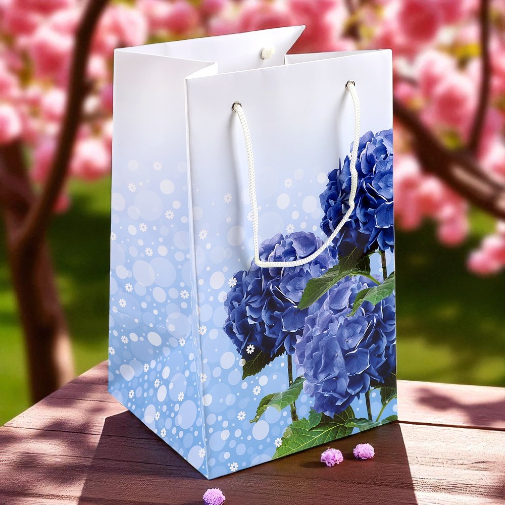Мы предлагаем оригинальный подарочный пакет нежно-голубого цвета с восхитительным узором в виде ярких цветков гортензии.