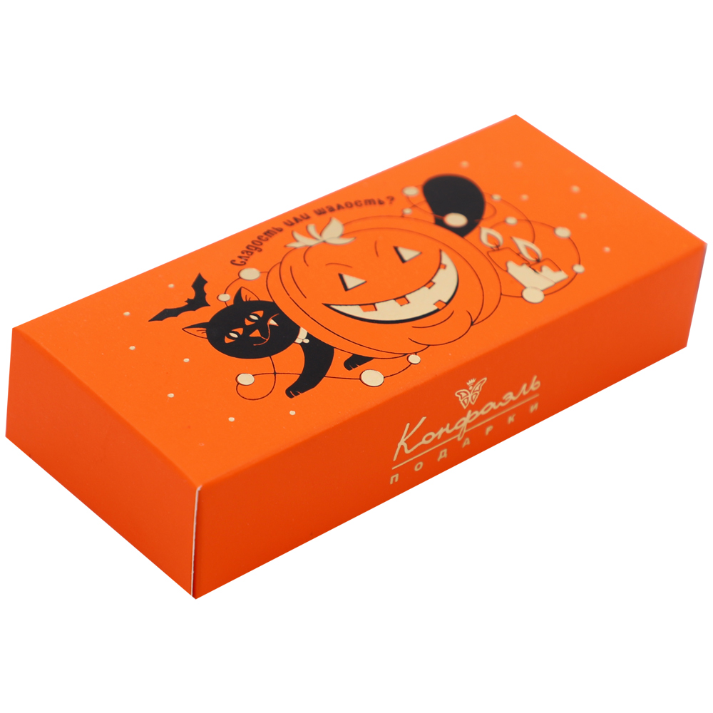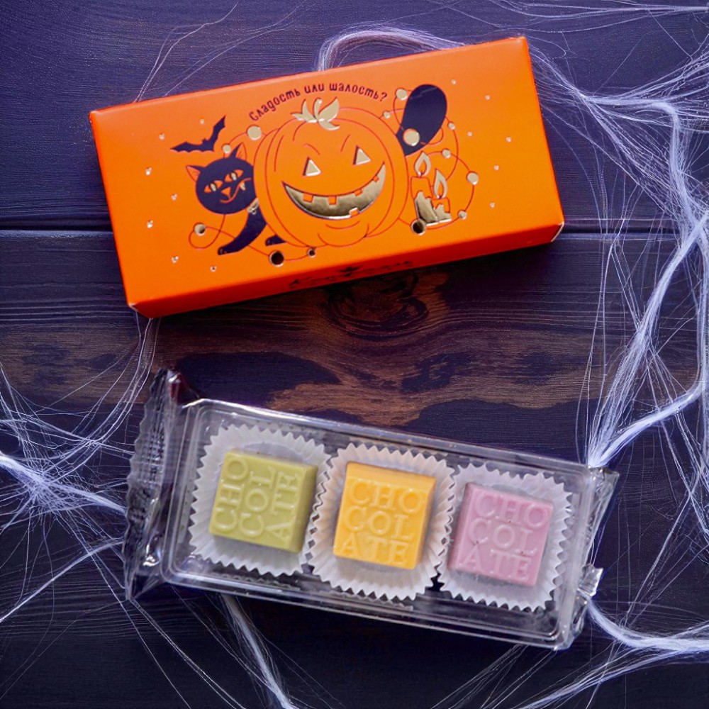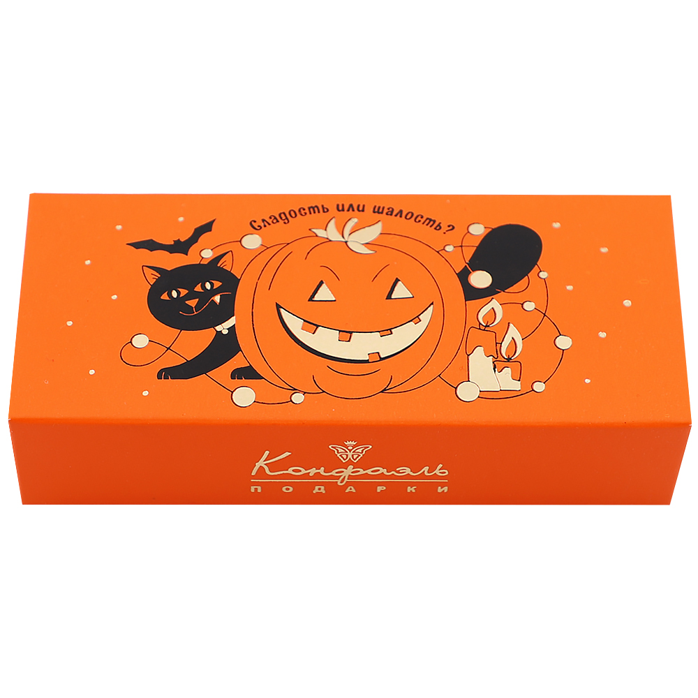 шоколадные массы: сахар, какао-масло, какао тертое, молоко сухое цельное, молоко сухое обезжиренное, лактоза, эмульгатор (лецитин соевый), ароматизатор; начинки: сахар, патока, молоко сгущенное (молоко цельное, сахар, лактоза), сливки сгущенные с сахаром (сливки нормализованные, сахар, лактоза), масло растительное, мальтодекстрин, коньяк (дистилят коньячный, вода, сахар, натуральный краситель Карамельный коллер), консервант сорбиновая кислота, эмульгаторы: лецитин соевый, Е471, экстракт маракуйи, натуральный краситель Паприка; декор – красители (Е100, Е132, Е171).