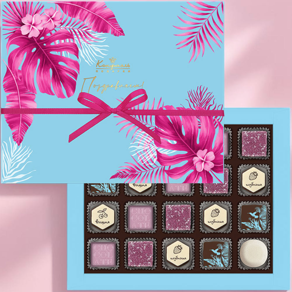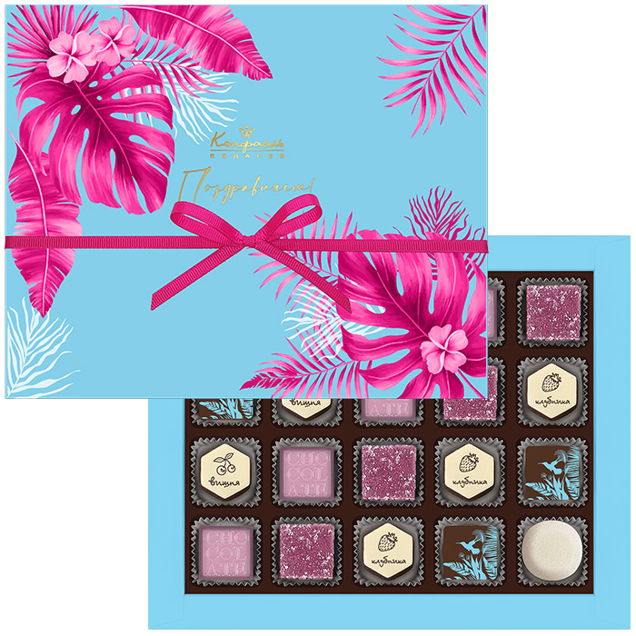 Состав: шоколадные массы – сахар, тертое какао, какао-порошок, масло какао, сыворотка молочная сухая, пахта сухая, сухое цельное молоко, сухое обезжиренное молоко, молочный жир, паста ореховая из ядер фундука, эмульгаторы (лецитин соевый, Е476), соль, ароматизаторы, натуральная ваниль; начинки – сахар, патока, молоко сгущенное (молоко цельное, сахар (сахароза, лактоза)), молоко сухое цельное, молоко сухое обезжиренное, масла растительные рафинированные дезодорированные (подсолнечное, рапсовое, оливковое; масло сливочное, молоко сухое обезжиренное), жир специального назначения (масло ши, рапсовое масло, соевое масло), натуральные концентрированные соки (черника, вишня, клубника), стабилизатор (мальтодекстрин), желирующий агент (агар), желатин говяжий, коньяк (дистиллят коньячный, вода, сахар, пищевой краситель «Сахарный колер»), экстракт лаванды, консервант (сорбиновая кислота), регулятор кислотности (лимонная кислота), эмульгаторы (лецитин соевый, Е471), ароматизаторы, пищевые красители (Е171), «Сахарный колер»; декор – пищевые красители (Е132, Е171). Внимание! Продукция производится на предприятии, где используются арахис, кунжут, орехи, яичные и молочные продукты, злаки, содержащие глютен.