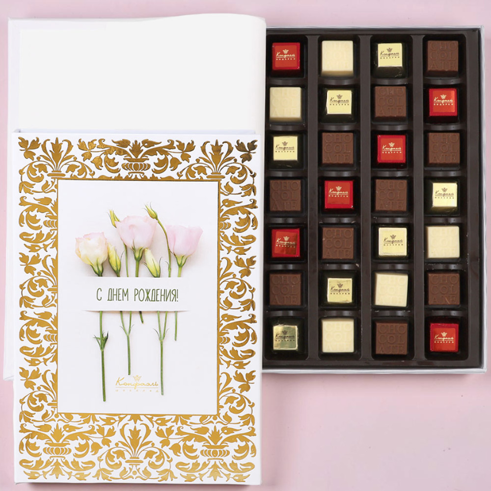 Cостав: шоколадные массы – сахар, масло какао, молоко цельное сухое, сухое обезжиренное молоко, какао тертое, какао-порошок, сыворотка молочная сухая, пахта сухая, молочный жир, паста ореховая из ядер фундука, эмульгаторы (соевый лецитин, Е476), соль, натуральная ваниль, ароматизаторы; начинки – сахар, патока, какао-масло, какао тертое, молоко сгущенное (молоко цельное, сахар (сахароза, лактоза)), жир специального назначения (масло ши, рапсовое масло, соевое масло, антиокислитель (лимонная кислота)), молоко сухое цельное, молоко сухое обезжиренное, белый шоколад (сахар, масло какао, сухое обезжиренное молоко, сухое цельное молоко, эмульгатор (лецитин соевый), экстракт ванили), масла растительные рафинированные дезодорированные (подсолнечное, рапсовое, оливковое; масло сладко-сливочное, молоко сухое обезжиренное), стабилизатор (мальтодекстрин), коньяк (дистиллят коньячный, вода, сахар, пищевой краситель (сахарный колер)), консервант (сорбиновая кислота), регулятор кислотности (лимонная кислота), эмульгаторы (лецитин соевый, Е471), ароматизаторы, пищевые красители (сахарный колер)