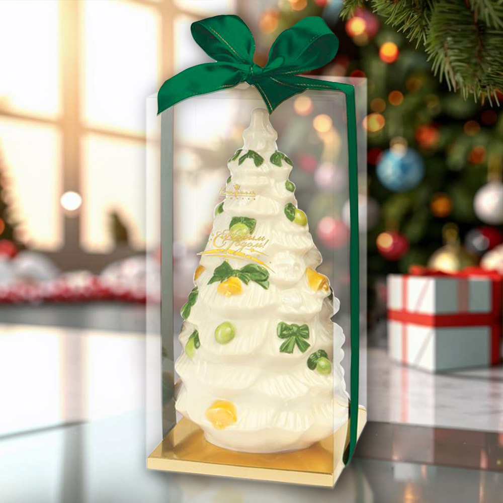 Огромная елка, изготовленная из нежнейшего белого шоколада, станет самым вкусным лакомством для маленьких сладкоежек. Роскошный сувенир к Новому году!