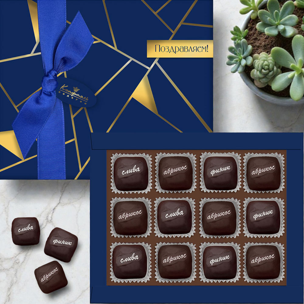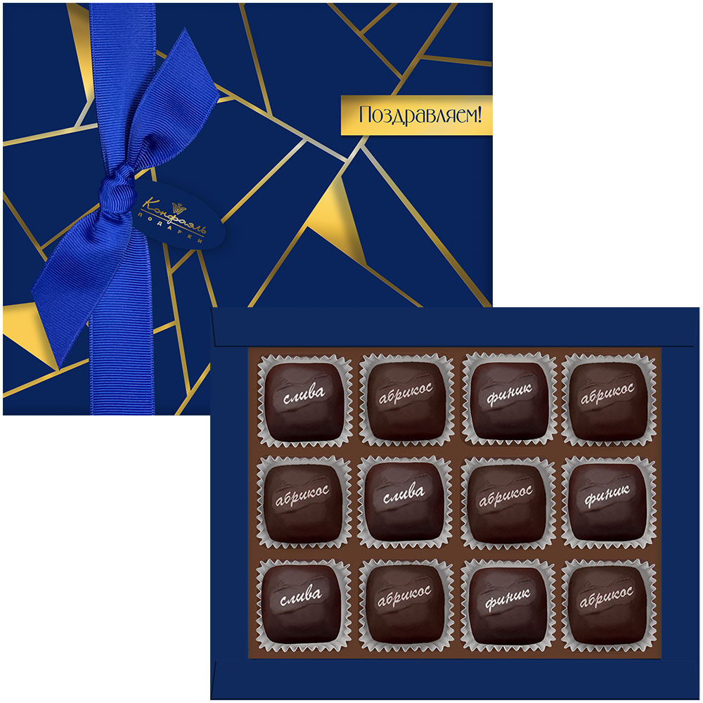 Состав: шоколад - сахар, какао тёртое, масло какао, эмульгатор (лецитин соевый), ароматизатор; начинки – сахар, патока, молоко сгущенное(молоко цельное, сахар (сахароза, лактоза)), какао-масло, стабилизатор (мальтодекстрин), коньяк (дистиллят коньячный, вода, сахар, натуральный пищевой краситель «карамельный колер»), чернослив, финики, абрикосы сушеные.