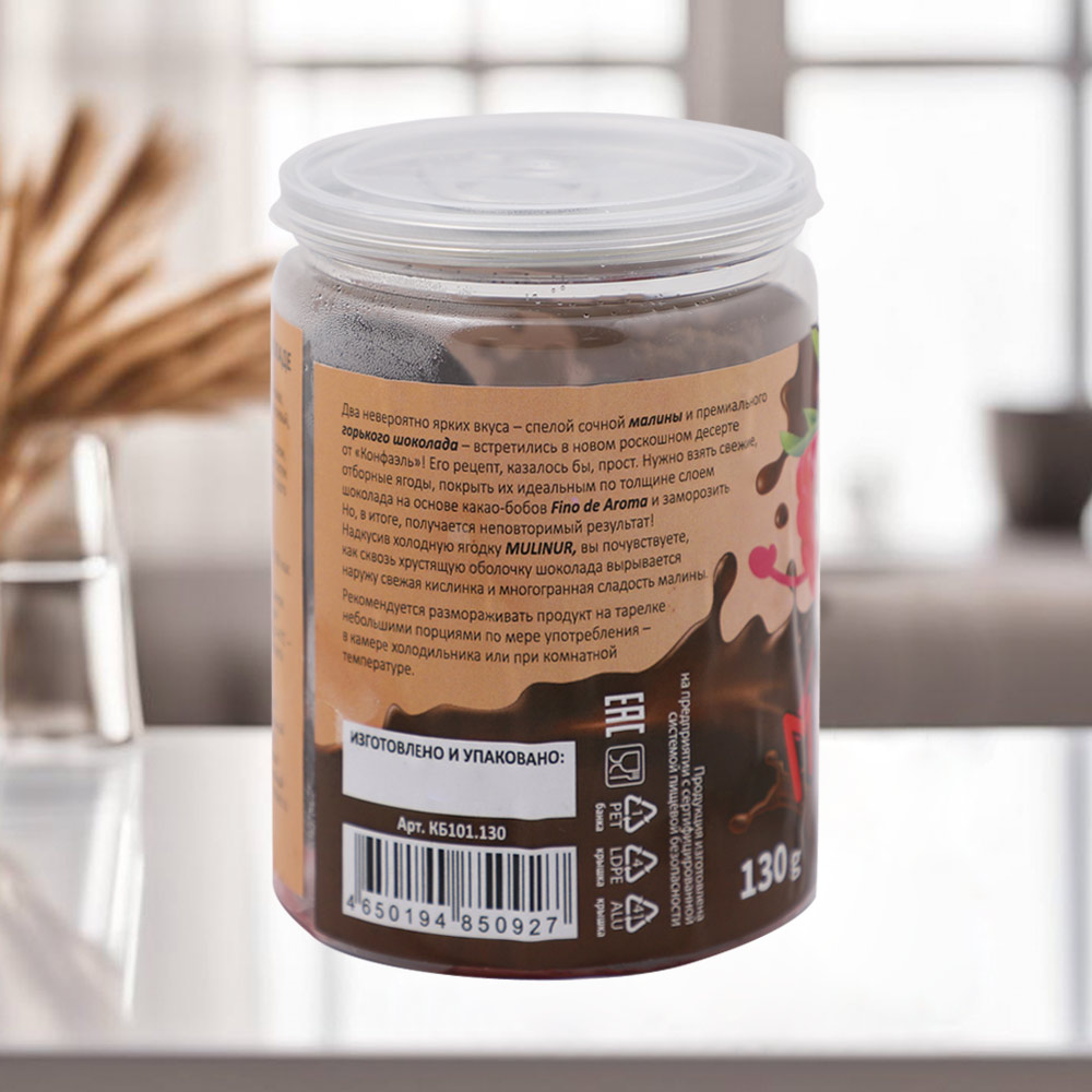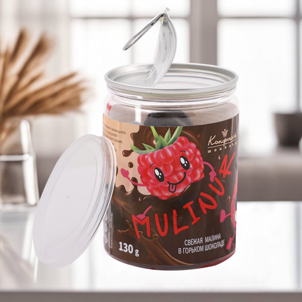 Состав: малина быстрозамороженная, горький шоколад (сахар, тёртое какао, масло какао, какао-порошок, эмульгатор (лецитин соевый), натуральная ваниль).