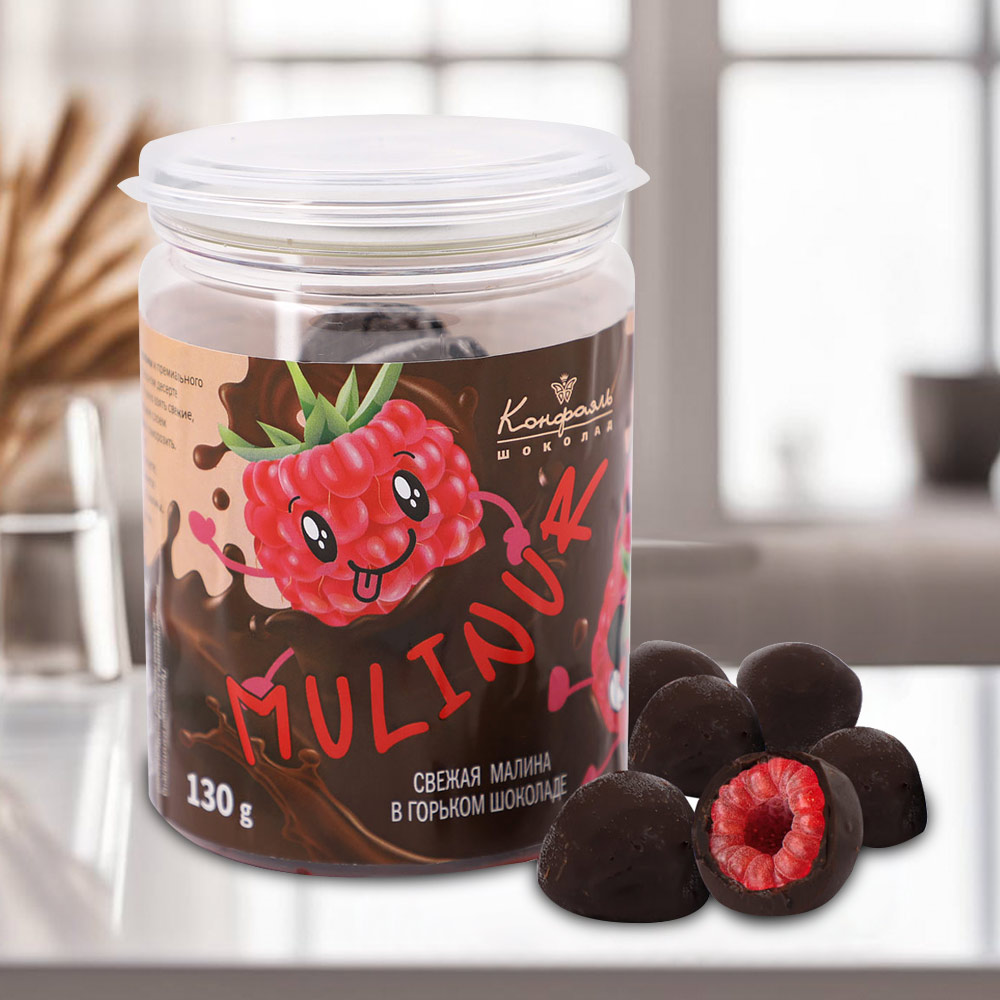Сочная свежая малина MULINUR в горьком шоколаде.