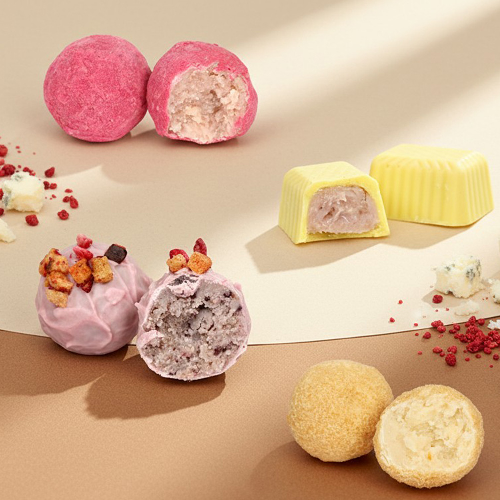 В коллекции — конфеты с сырами Камамбер, Грюйер, Гран При, Таледжио и Чеддер, дополненные авторскими ганашами на белом и молочном шоколаде. Ягодные настойки, апельсиновые ноты, коньяк, кофе и сублимированные ягоды раскрывают характер каждого сыра и создают сложную, многогранную палитру вкуса.