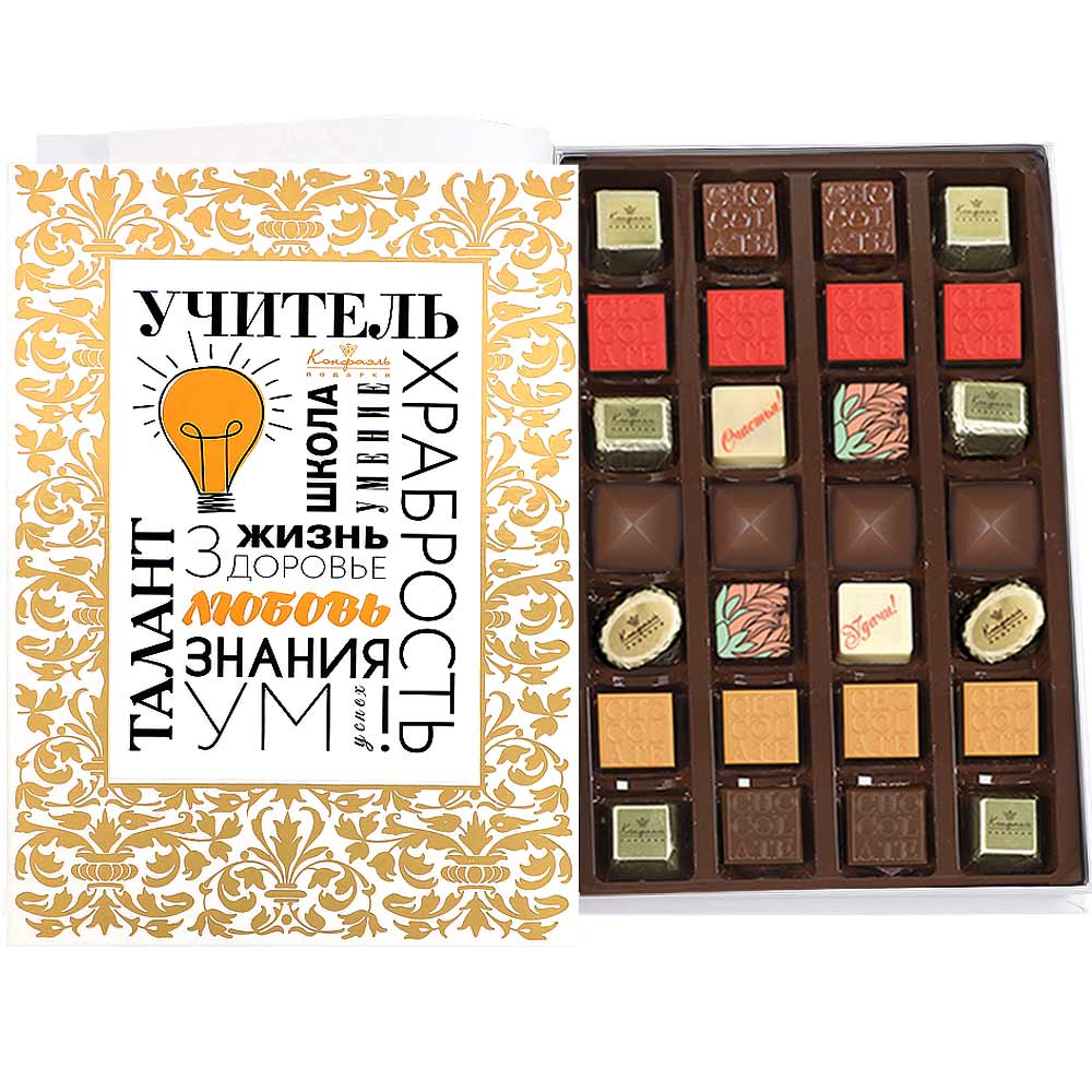 шоколадные массы - какао-масло, какао тертое, сахар, молоко сухое цельное, молоко сухое обезжиренное, лактоза, эмульгатор (лецитин соевый), ароматизатор («Ванилин»); начинки - сахар, патока, какао-масло, какао тертое, молоко сгущенное (молоко цельное, сахар (сахароза, лактоза)), сливки сгущенные с сахаром (сливки нормализованные, сахар (сахароза), лактоза), молоко сухое, рафинированные дезодорированные растительные масла, натуральные концентрированные соки, стабилизатор (мальтодекстрин, гуммиарабик), желирующие агенты (агар, желатин говяжий), коньяк (дистиллят коньячный, вода, сахар, натуральный пищевой краситель «карамельный колер»), спирт этиловый ректификованный, консервант (сорбиновая кислота), регулятор кислотности (лимонная кислота), эмульгаторы (лецитин соевый, Е471), ароматизаторы («Вишня», «Апельсин», «Ваниль», «Черная смородина»,«Клубника», «Карамель», «Кофе», «Кокосовые сливки», «Бейлиз»), натуральный пищевой краситель «Карамельный колер»; декор - пищевые красители (куркумин, Е132, Е171), пищевой краситель (концентрированный сок красной свёклы, масло подсолнечное, эмульгаторы (мальтодекстрин, Е472с), регуляторы кислотности (лимонная кислота, аскорбиновая кислота))