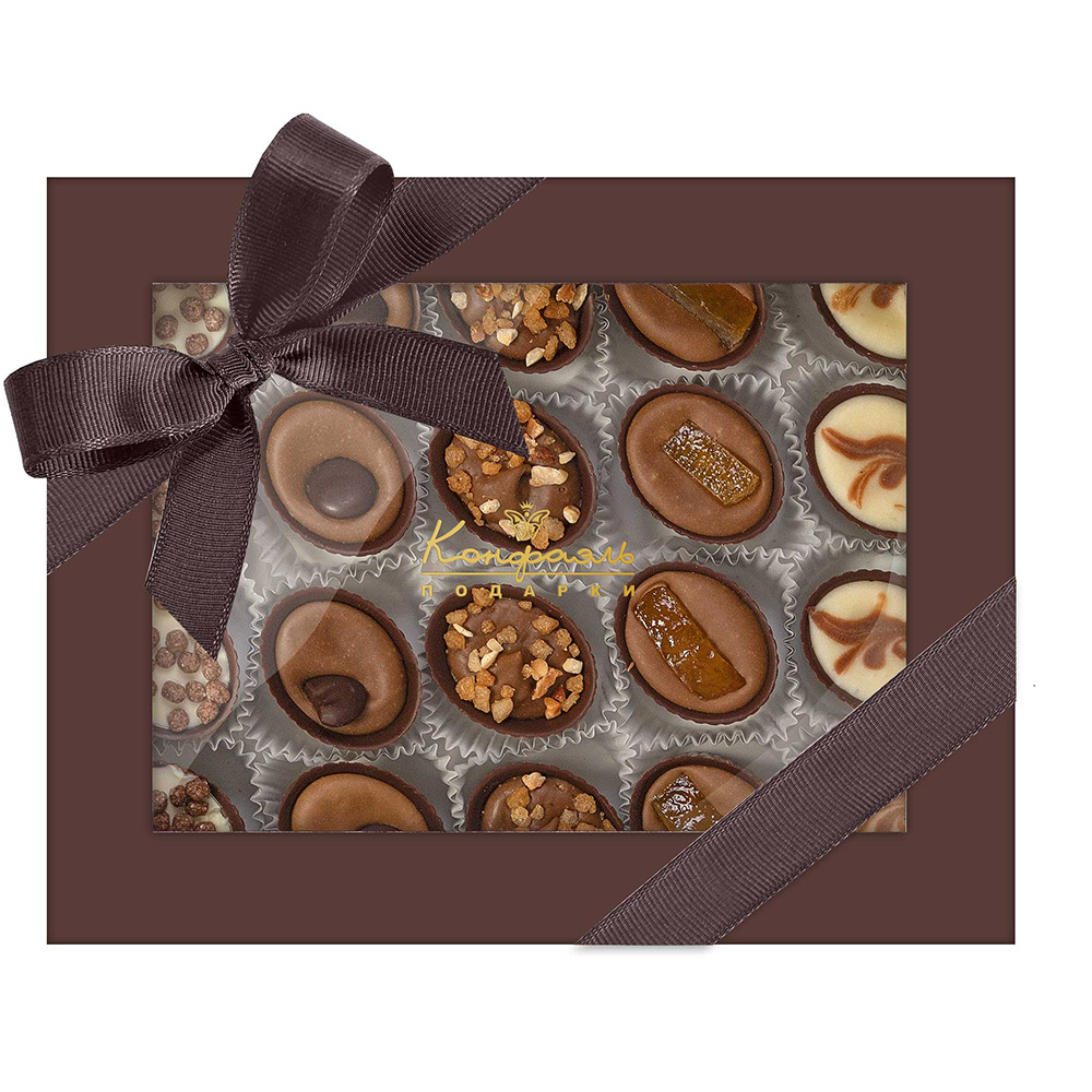 Состав: шоколад – сахар, какао тёртое, масло какао, эмульгатор (лецитин соевый), ароматизатор; начинки – сахар, какао-масло, молоко сухое обезжиренное, масла растительные рафинированные дезодорированные (подсолнечное, рапсовое, оливковое; масло сливочное (из пастеризованных коровьих сливок), молоко сухое обезжиренное), паста из кофе (кофе, растительный жир), рис воздушный с какао (крупа рисовая, сахар, какао, соль), цукаты апельсиновых корочек, апельсин сушеный, кофе натуральный молотый, эмульгаторы (лецитин соевый, Е471), ароматизаторы. Продукция производится на предприятии, где используются арахис, кунжут, орехи, яичные и молочные продукты, злаки, содержащие глютен.