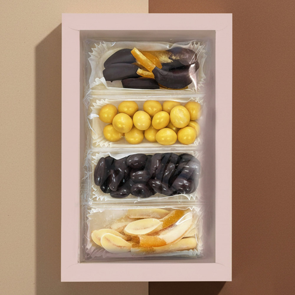 Драже "Ананас" в белом шоколаде с декором, "Миндаль" в молочном шоколаде, конфеты глазированные молочным шоколадом "Цукаты" (апельсиновые корочки), конфеты глазированные белым шоколадом "Цукаты" (апельсиновые корочки)
