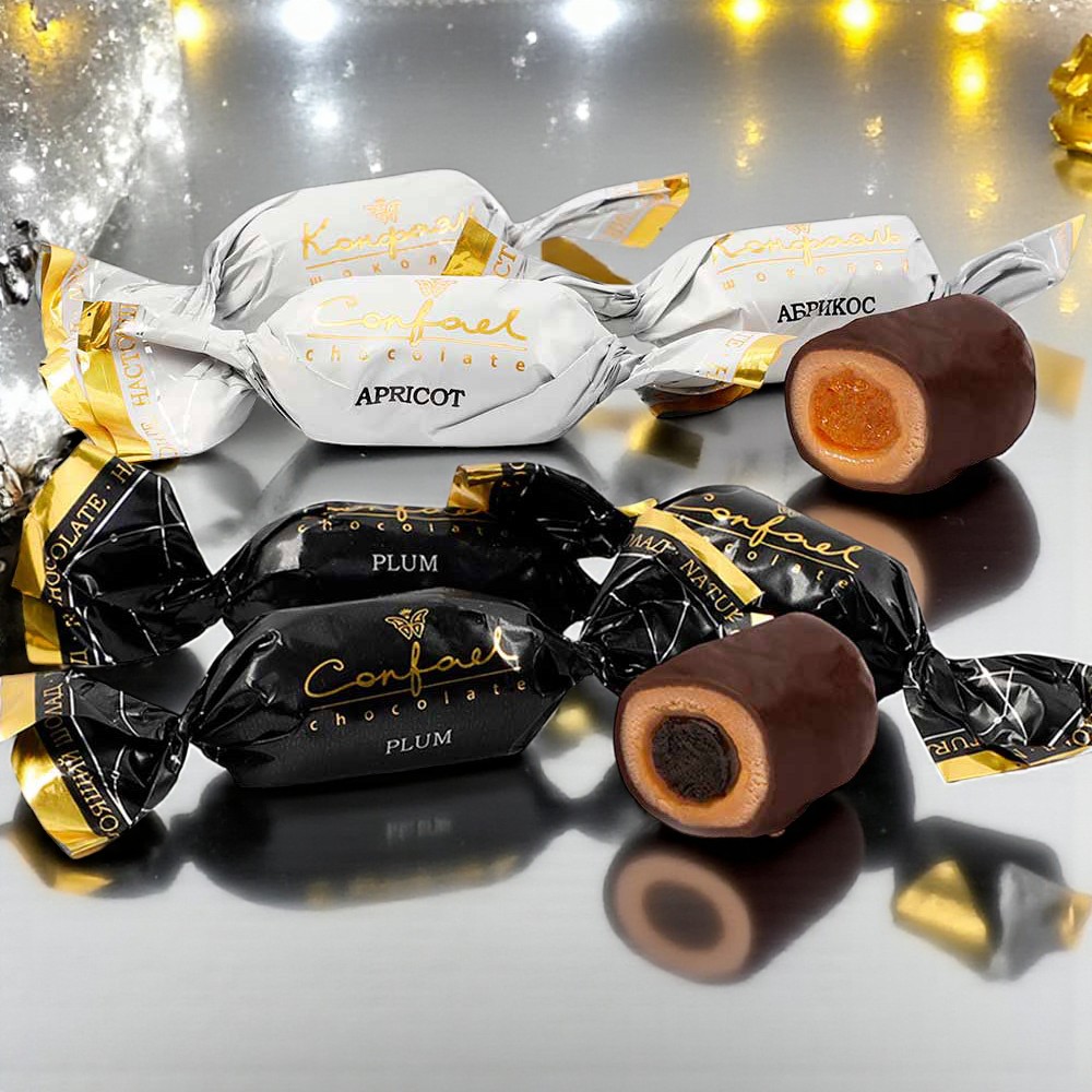Состав: шоколадная масса – сахар, тертое какао, масло какао, какао-порошок, эмульгатор (лецитин соевый), натуральная ваниль; начинки – сахар, патока, какао-масло, молоко сгущенное (молоко цельное, сахар (сахароза, лактоза)), масло сладко-сливочное, белок яичный, абрикос сушеный, чернослив, какао-порошок, стабилизатор (мальтодекстрин), желирующие агенты (агар), коньяк (дистиллят коньячный, вода, сахар, пищевой краситель «сахарный колер»), экстракт ванили, консервант (сорбиновая кислота), регулятор кислотности (лимонная кислота), эмульгаторы (лецитин соевый, Е471), ароматизаторы.