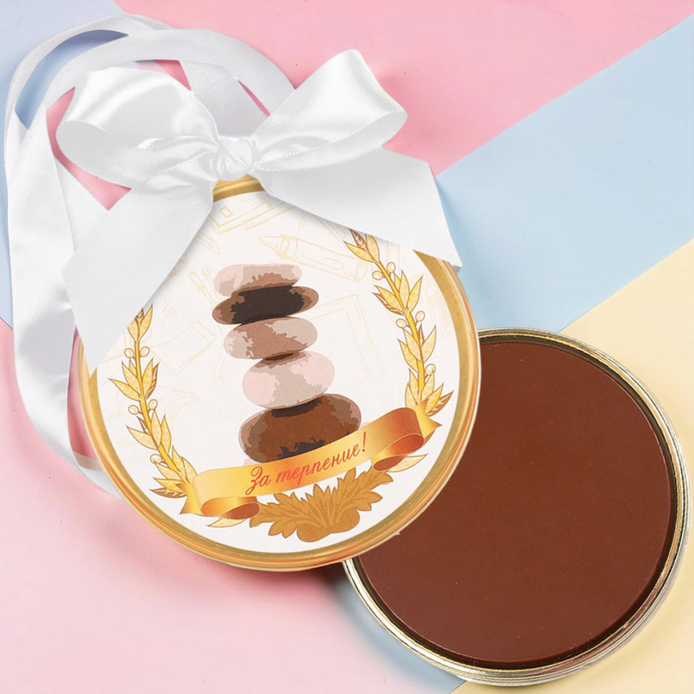 Медаль из молочного шоколада в дизайнерском оформлении - замечательный презент вашим близким! Ведь с его помощью вы легко докажете им, как высоко цените в них самое главное человеческое качество - терпение.